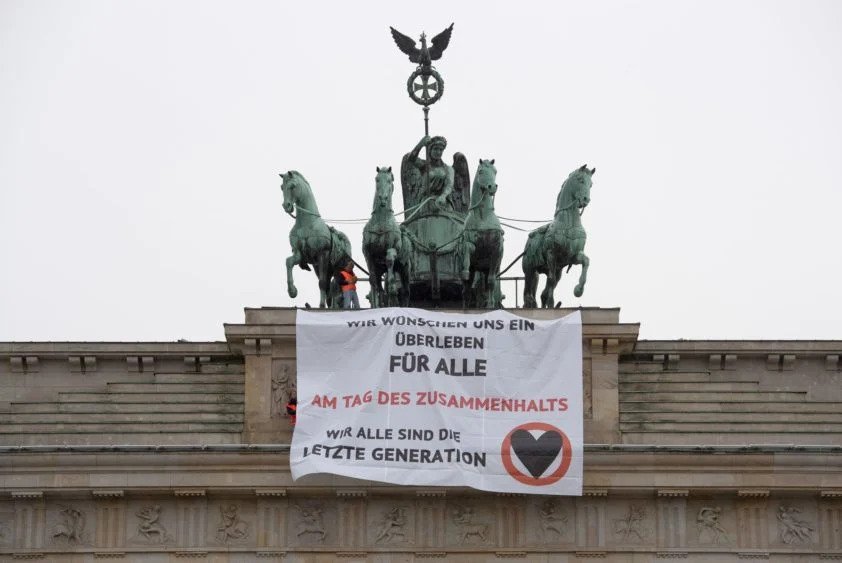 Berlin, 9 Kasım 22 (TAK): Almanya'da çevre ve iklim aktivistleri iklim değişikliğine dikkati çekmek için Berlin'deki Brandenburg Kapısı'nın üzerine çıkarak eylem gerçekleştirdi.