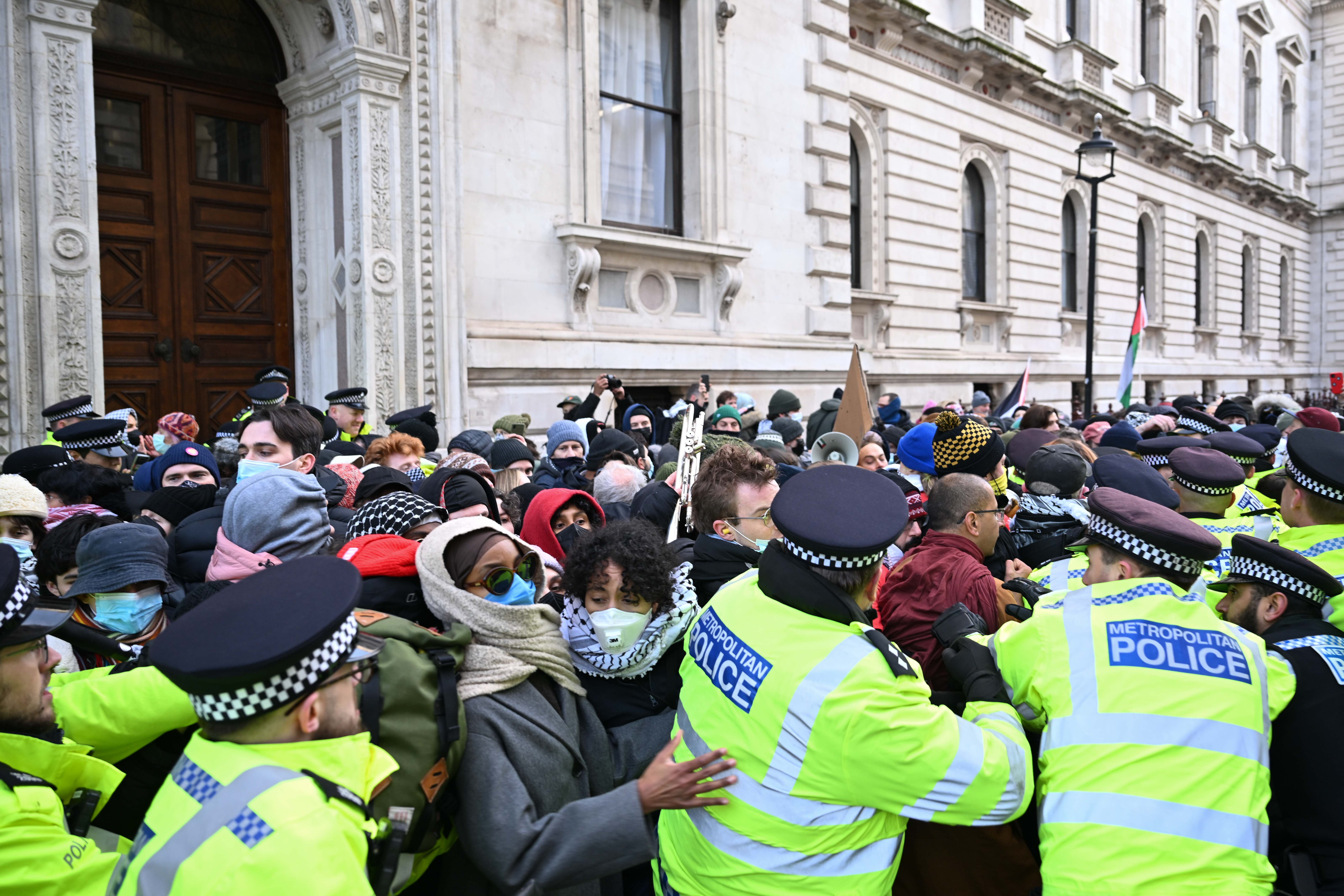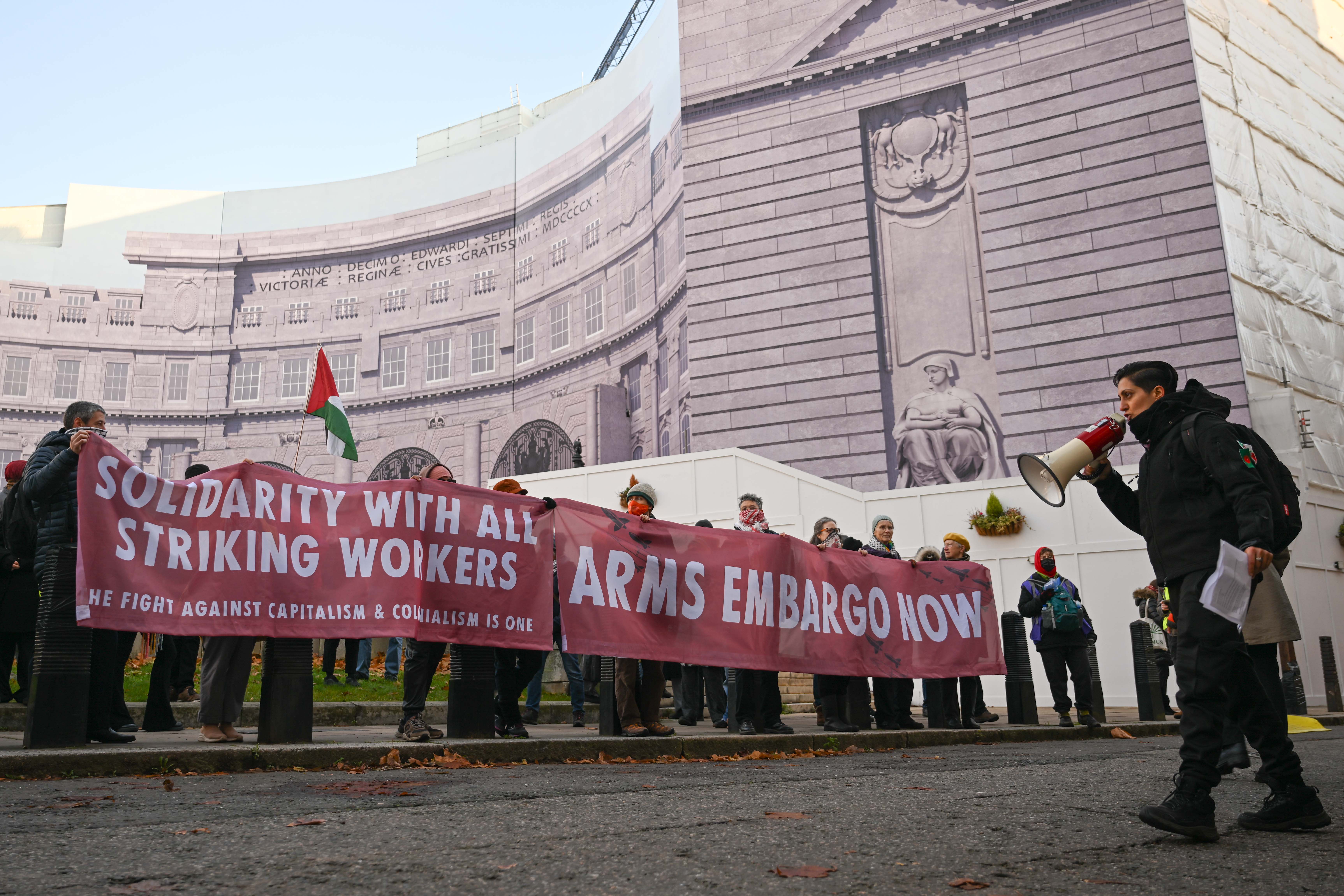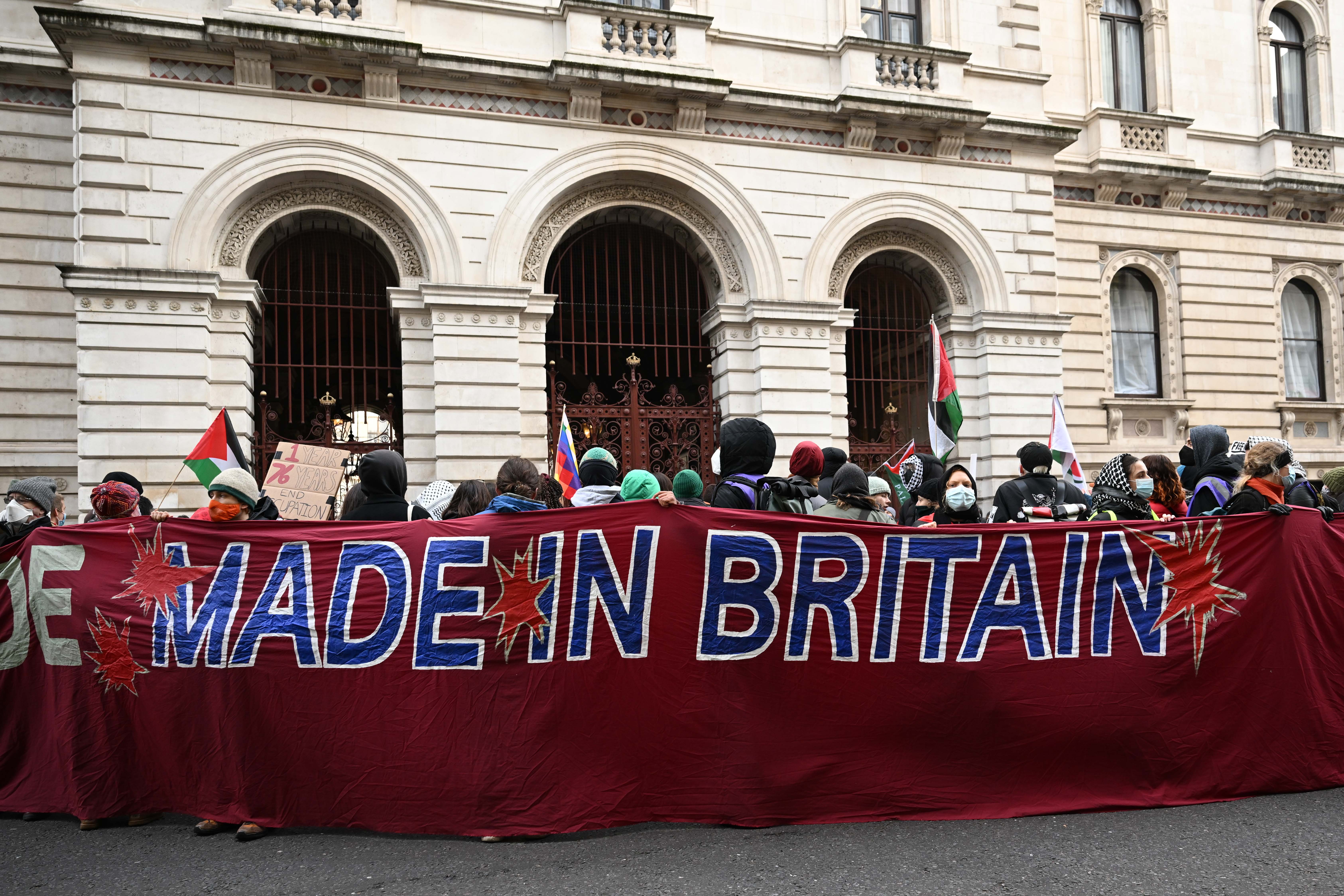 Londra, 28 Kasım 24 (TAK): İngiltere'de Filistin destekçisi gruplar, Dışişleri Bakanlığının girişini kapatarak İngiltere'nin İsrail'e tüm silah satışını sonlandırması çağrısında bulundu.