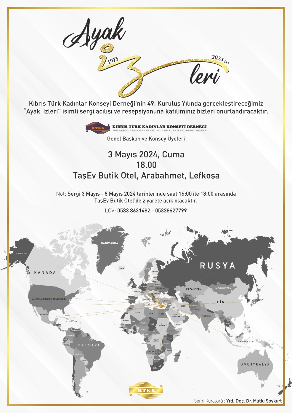 Lefkoşa, 2 Mayıs 24 (TAK): Kıbrıs Türk kadınlar Konseyi’nin 49’uncu kuruluş yılında, “Ayak İzleri” isimli sergi açılışı ve resepsiyon düzenlenecek.