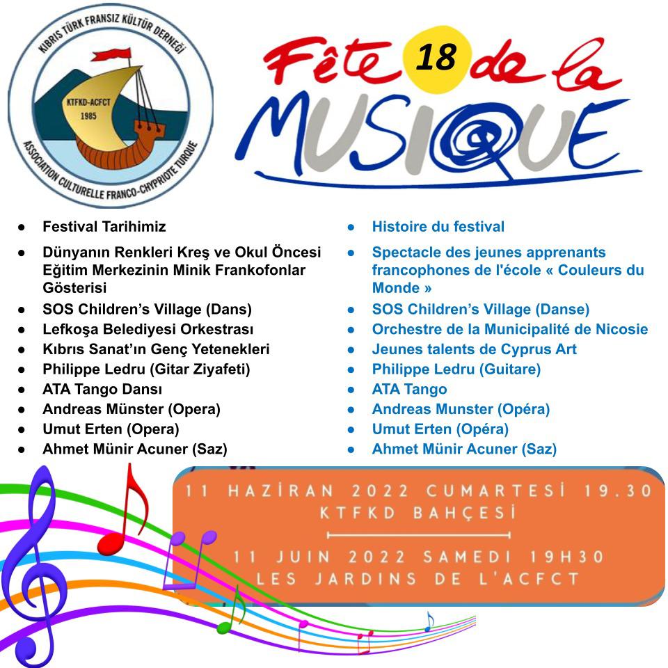 Lefkoşa, 9 Haziran 22 (TAK): Kıbrıs Türk Fransız Kültür Derneği (KTFKD) geleneksel olarak her yıl Fransa ve yaklaşık 120 ülkede kutlanan Müzik Bayramı kapsamında profesyonel ve amatör sanatçılarının da katılımıyla etkinlik gerçekleştirecek.