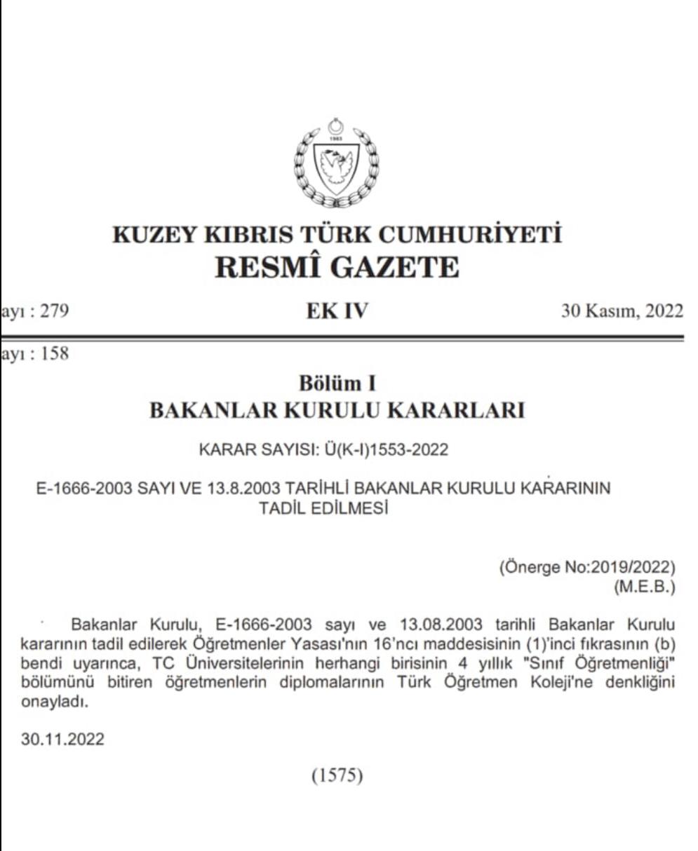 öğretmenliği ve okul öncesi eğitim öğretmenliği bölümlerinin denkliğini onaylayan kararının, sadece okul öncesi eğitim öğretmenliği kısmını iptal kararının samimi