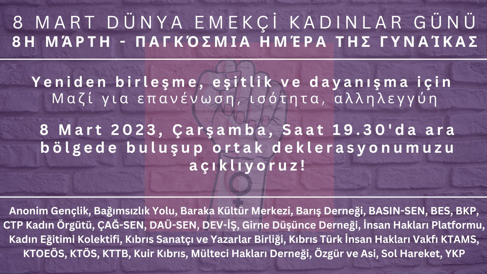 Lefkoşa, 7 Mart 23 (TAK): Dünya Kadınlar Günü nedeniyle yarın yapılacak yürüyüş sonrasında ara bölgede Ledra Palace'da iki toplumlu bir etkinlik yapılıp, "yeniden birleşme, eşitlik ve