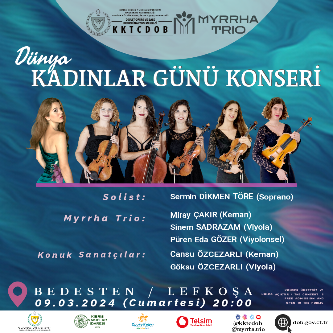 Lefkoşa, 8 Mart 24 (TAK): Başbakan Yardımcılığı, Turizm, Kültür, Gençlik ve Çevre Bakanlığı Devlet Opera ve Bale Koordinasyon Merkezi (KKTCDOB) ile Myrrha Trio iş birliğinde yarın “Dünya Kadınlar Günü Konseri” verilecek.