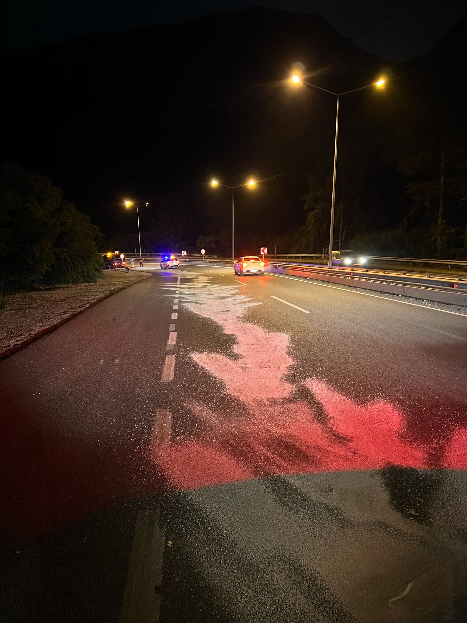 şeridi içerisine bir araçtan dökülen yağ nedeniyle yolda kayganlık meydana geldi.