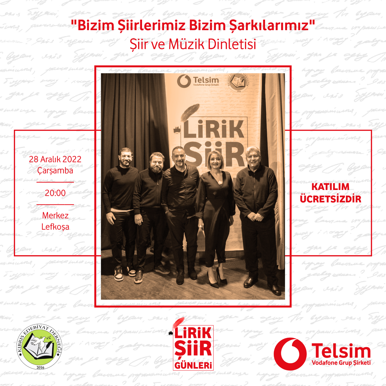 Lefkoşa, 26 Aralık 22 (TAK): Lirik Şiir Grubu, çarşamba gecesi Merkez Lefkoşa’da sahne alacak.