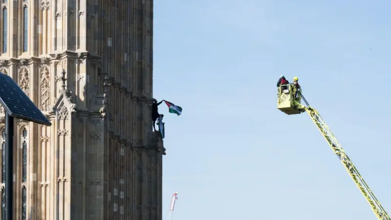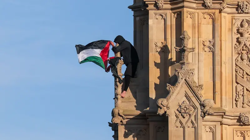 Ben saat kulesine cumartesi günü tırmanan bir kişi, Filistin bayrağı açarak