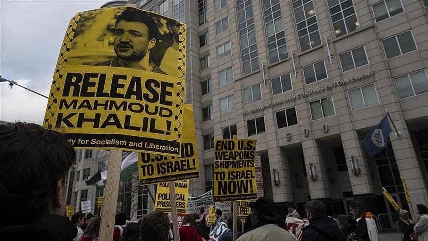 gözaltına alınan Filistinli aktivist Mahmud Halil'in salıverilmesi için gösteri