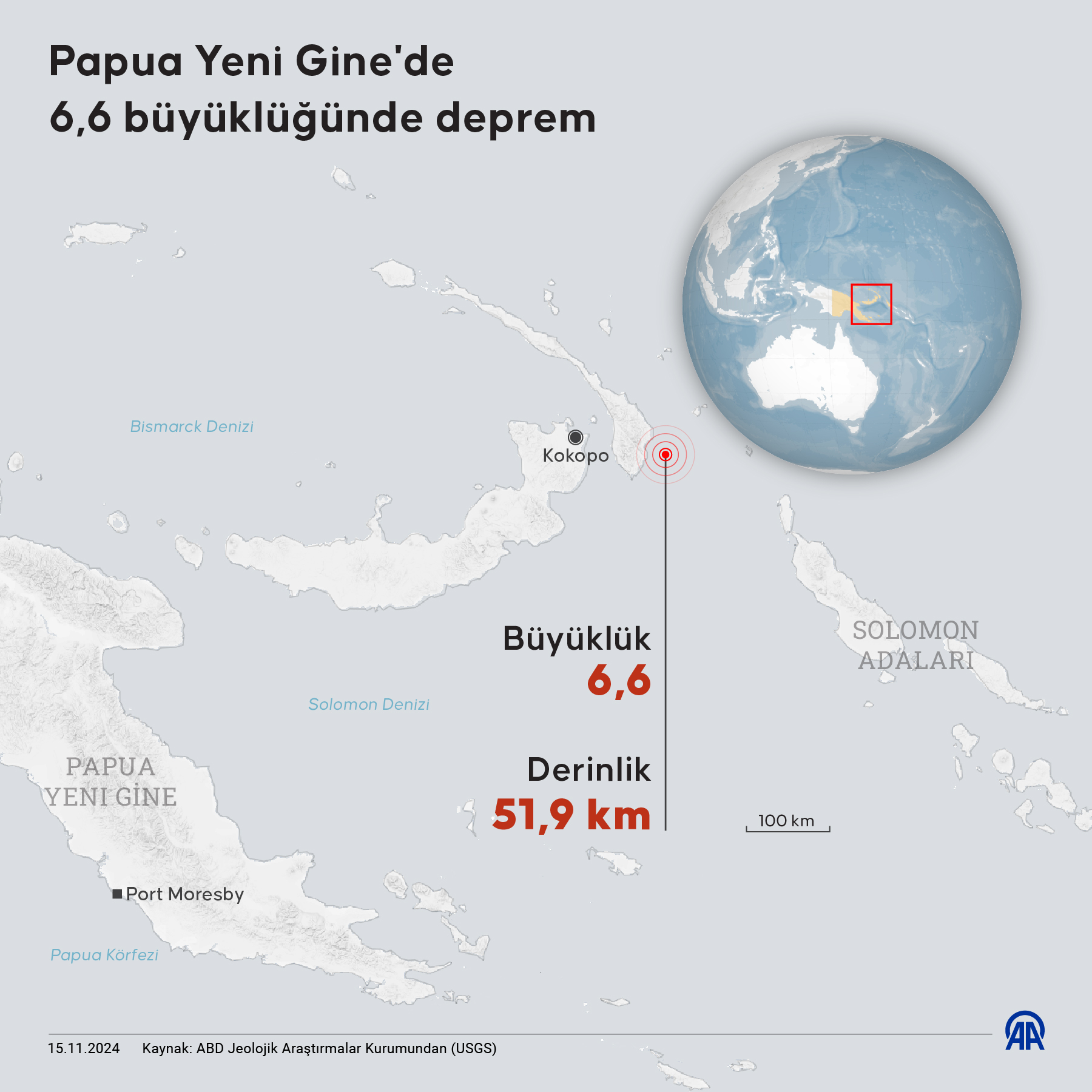 Ankara, 15 Kasım 24 (TAK): Okyanusya ülkesi Papua Yeni Gine'de 6,6 büyüklüğünde deprem meydana geldi.