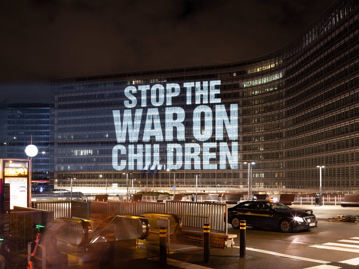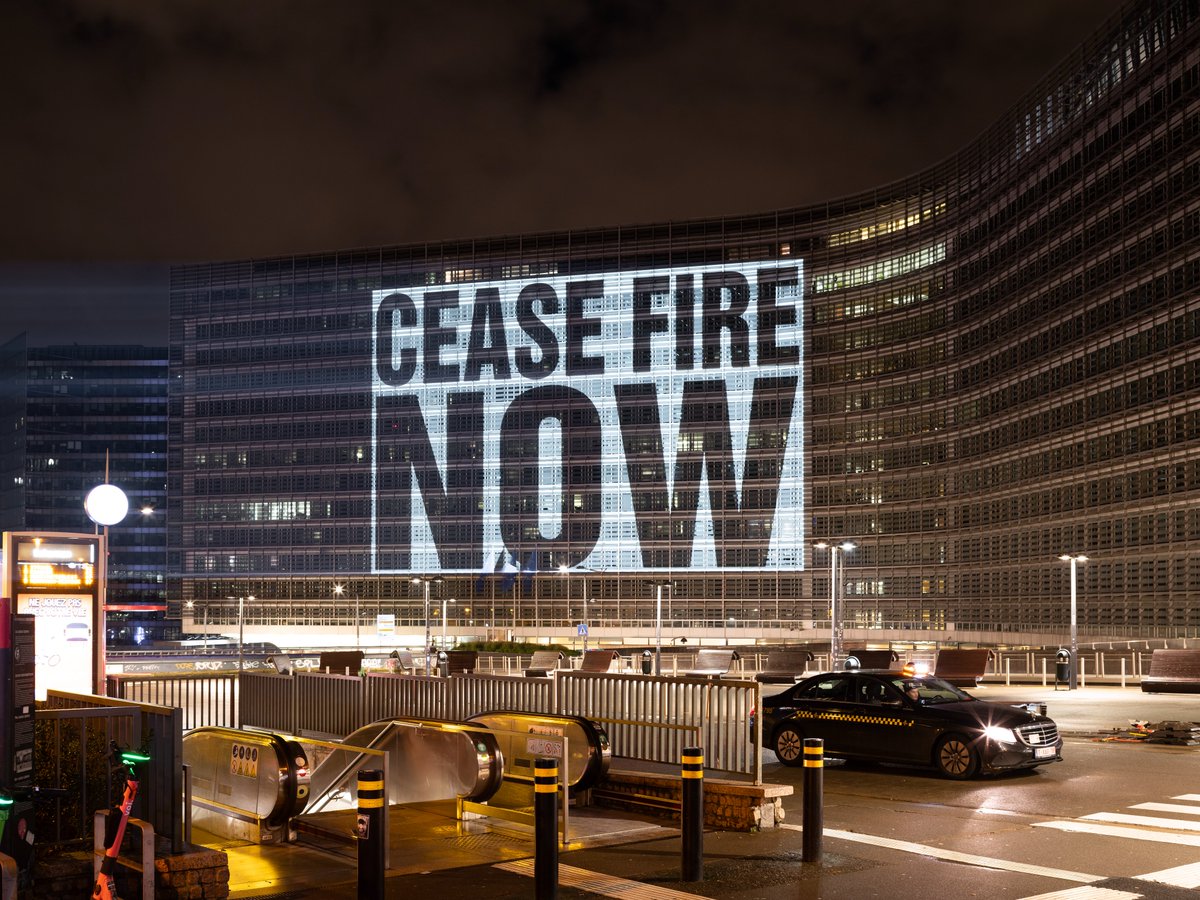 Brüksel, 13 Kasım 23 (TAK): İngiltere merkezli sivil toplum kuruluşu Save The Children (Çocukları Kurtarın), Avrupa Birliği (AB) Komisyonu binasına İsrail saldırılarının sürdüğü Gazze için projeksiyonla "Hemen Şimdi Ateşkes" yazısı yansıttı.