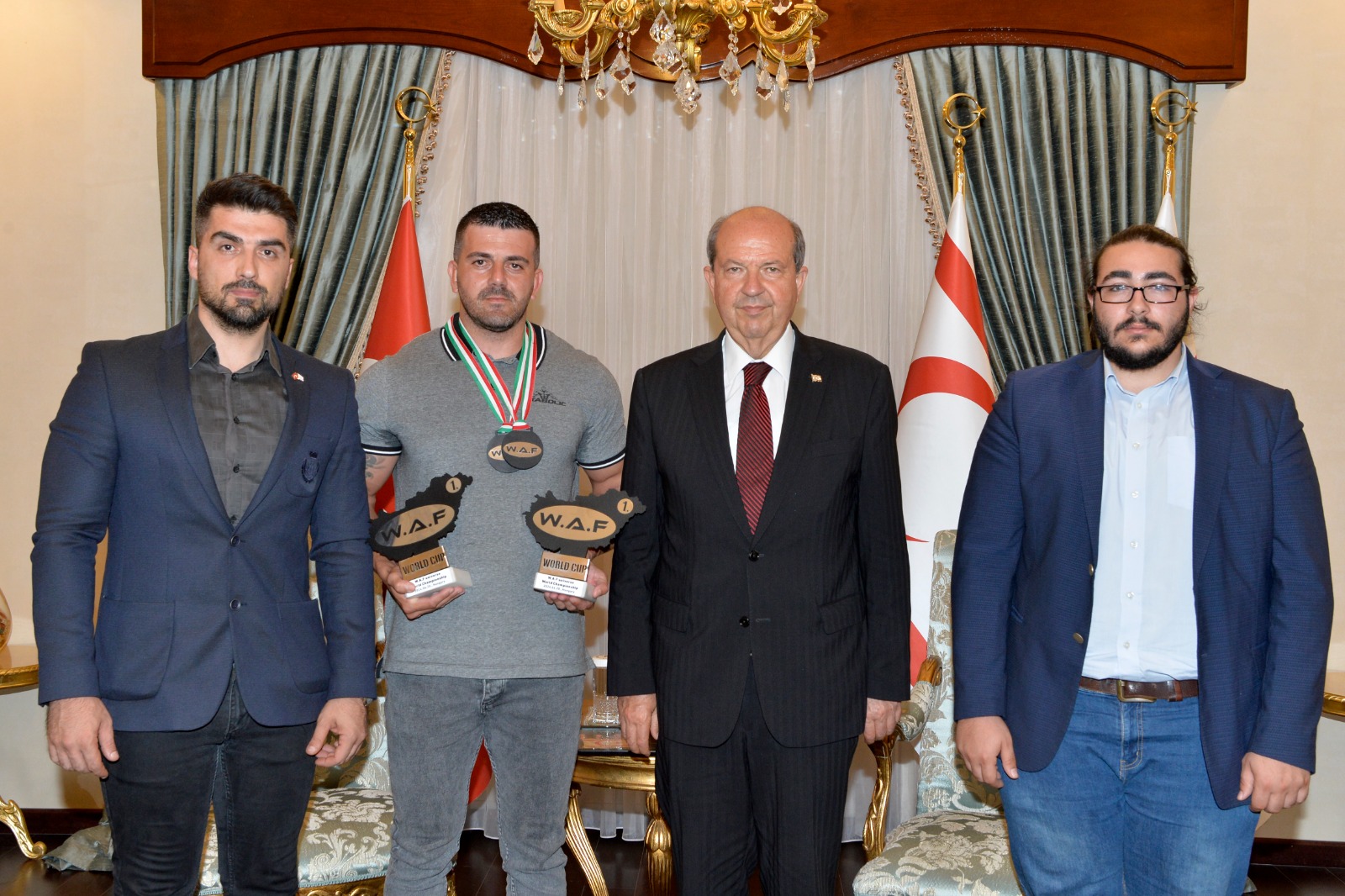 Lefkoşa, 10 Mayıs 24 (TAK): Cumhurbaşkanı Ersin Tatar, W.A.F. UNIVERSE Vücut Geliştirme ve Fitness Dünya Şampiyonası'nda iki farklı kategoride şampiyonluk elde eden Salahi Avcı ve beraberindeki heyeti kabul etti.