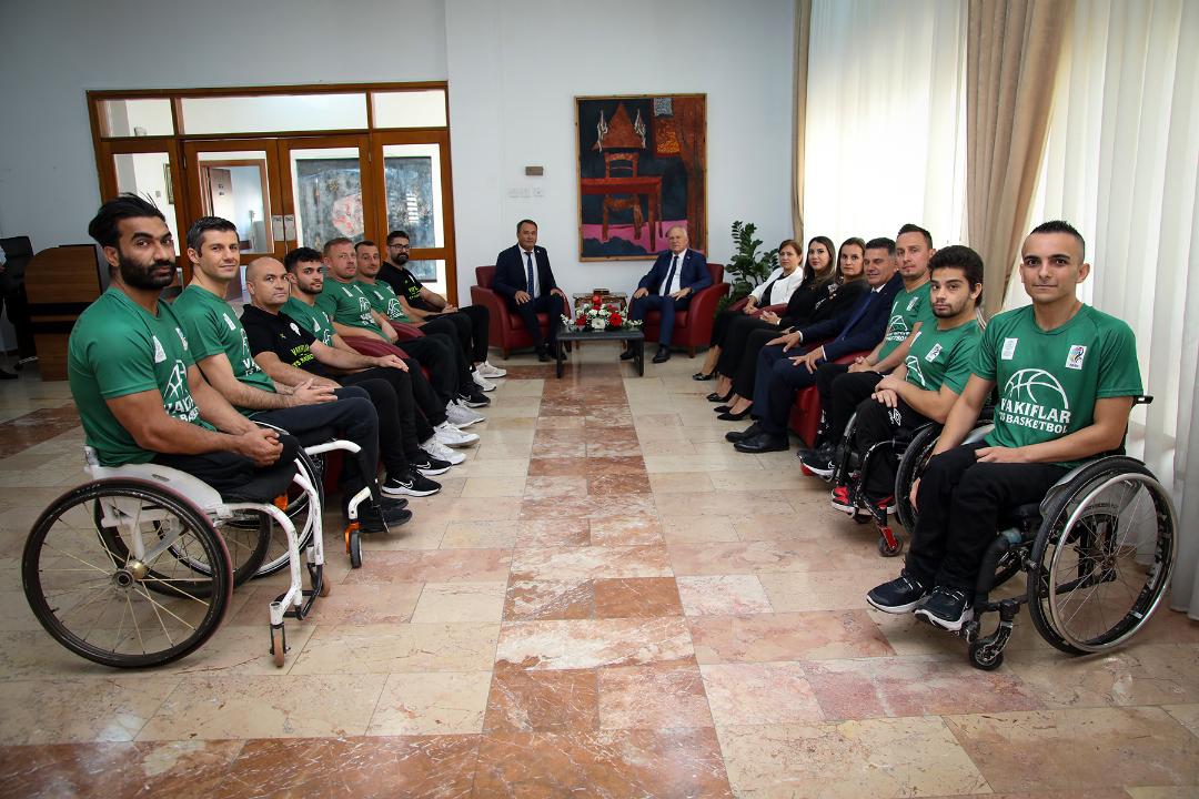 Başkanı Zorlu Töre, Engelliler Spor Federasyonu Başkanı Ahmet Akdeniz ve Türkiye Tekerlekli Basketbol 1. Ligi’nde mücadele eden Vakıflar Tekerlekli Sandalye Basketbol Takımı