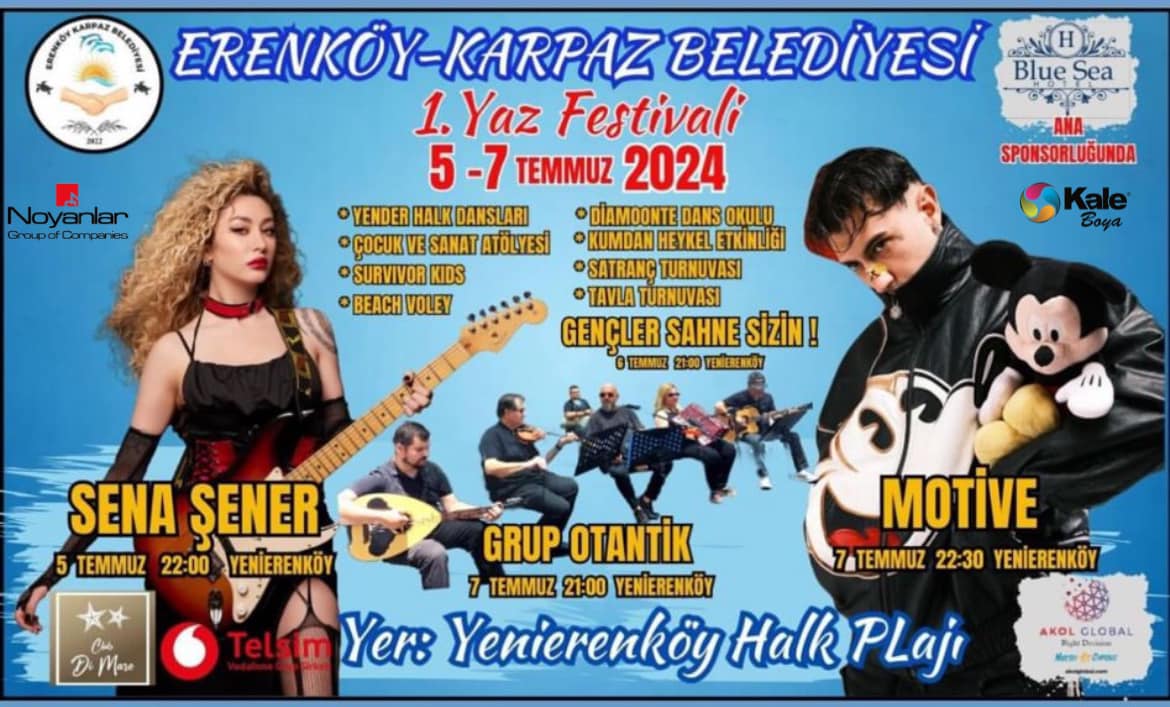 Lefkoşa, 3 Temmuz 24 (TAK): Erenköy-Karpaz Belediyesi 1.Yaz Festivali 5-7 Temmuz tarihleri arasında Yenierenköy Halk Plajı’nda gerçekleştirilecek.