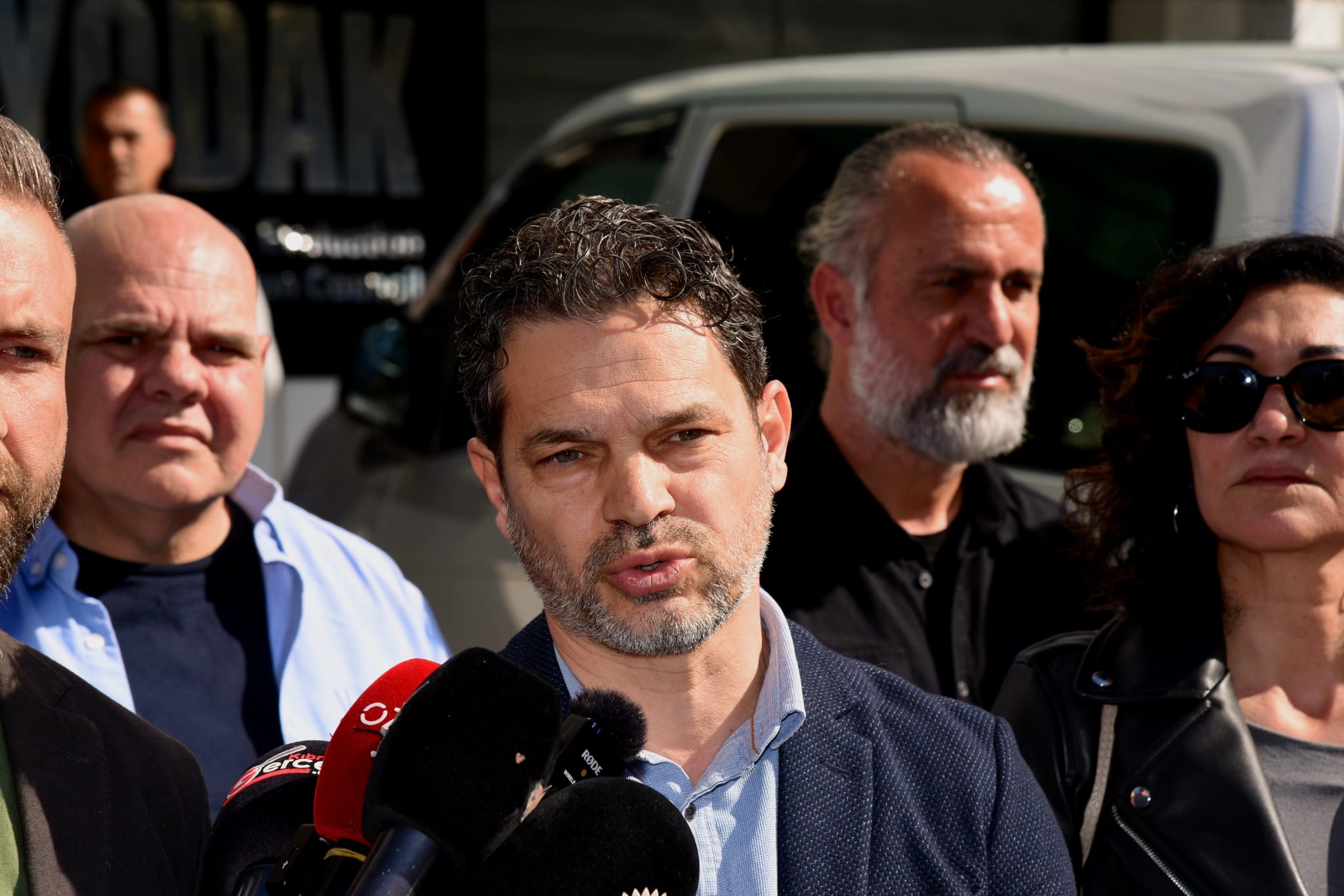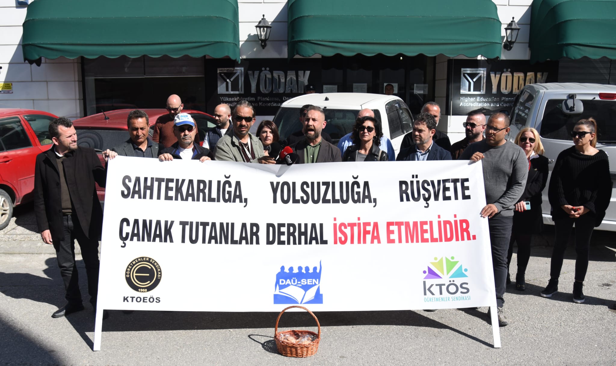 Lefkoşa, 11 Mart 24 (TAK): Öğretmen sendikalarından 3'ü YÖDAK önünde "bastişli" eylem yaparak, “Sahtekarlığa, yolsuzluğa, rüşvete çanak tutanlar