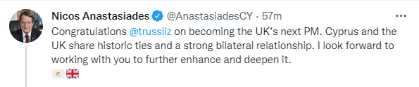 Lefkoşa, 7 Eylül 22 (TAK): Rum Yönetimi Başkanı Nikos Anastasiadis, İngiltere'nin yeni Başbakanı olarak seçilen Liz Truss’ı tebrik etti.