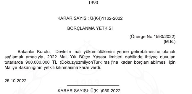 Lefkoşa, 27 Ekim 22 (TAK): Bakanlar Kurulu, Maliye Bakanlığı’na 900 milyon TL’ye kadar borçlanma yetkisi verdi.
