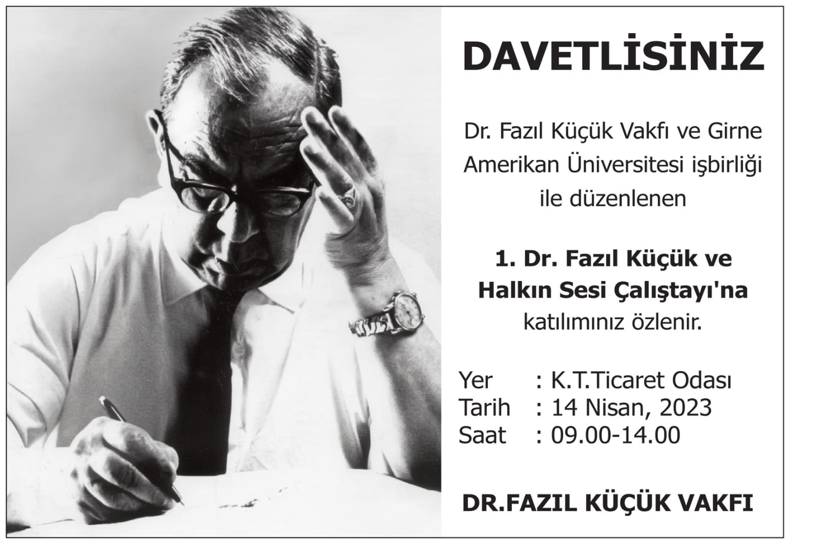 Lefkoşa, 12 Nisan 23 (TAK): Dr. Fazıl Küçük Vakfı ve Girne Amerikan Üniversitesi (GAÜ) iş birliğinde cuma günü “Dr. Fazıl Küçük ve Halkın Sesi Çalıştayı” düzenleniyor.