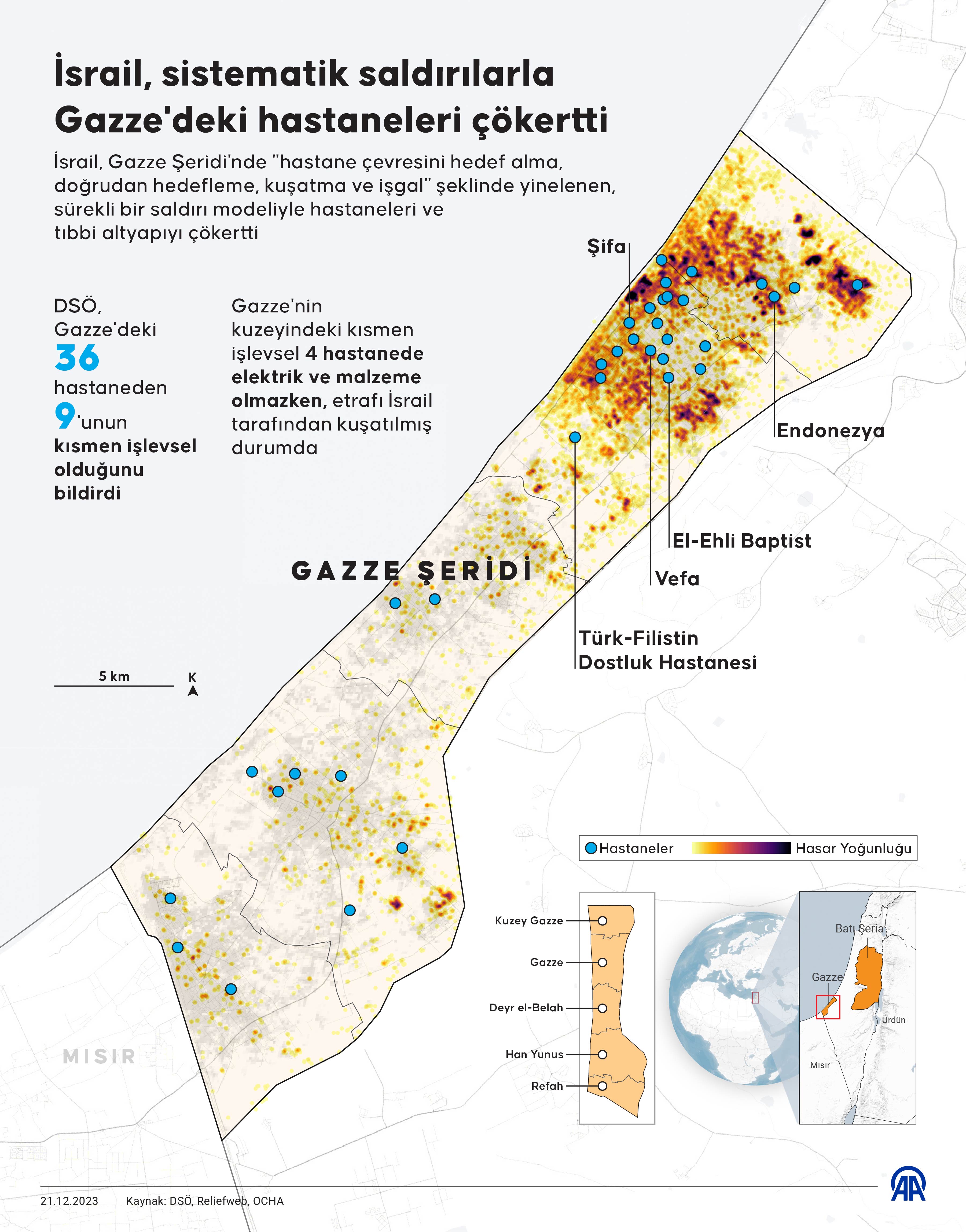 Ankara, 21 Aralık 23 (TAK): İsrail, Gazze Şeridi'nde "hastane çevresini hedef alma, doğrudan hedefleme, kuşatma ve işgal" şeklinde yinelenen, sürekli bir saldırı modeliyle hastaneleri ve tıbbi altyapıyı çökertti.