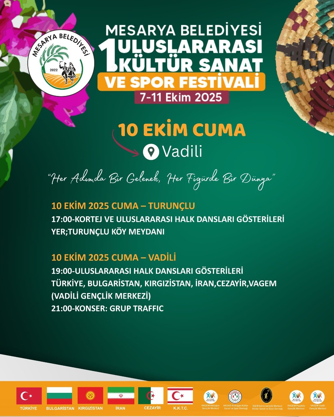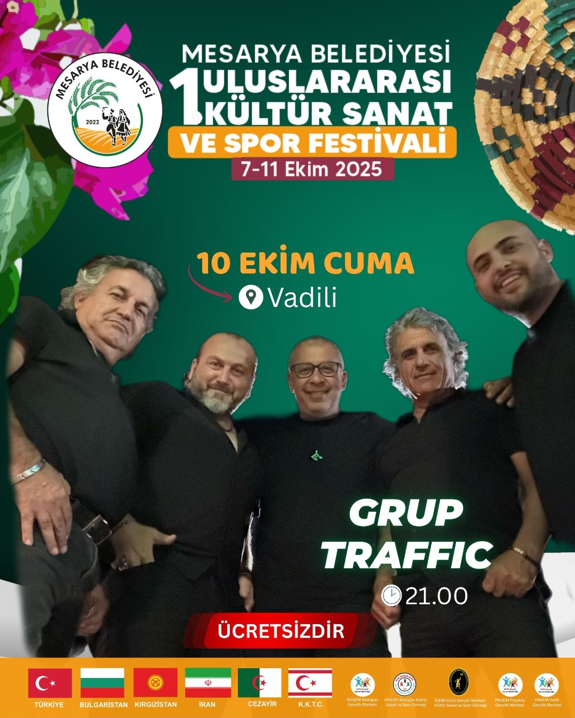 Lefkoşa, 10 Ekim 25 (TAK): Mesarya Belediyesi tarafından düzenlenen 1. Uluslararası Kültür, Sanat ve Spor Festivali’nde bu akşam Grup Traffic sahneye çıkacak.