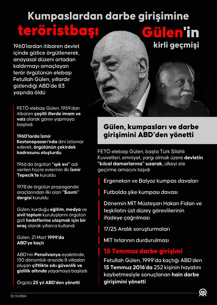 1960'lardan itibaren devlet içinde gizlice örgütlenerek, anayasal düzeni ortadan kaldırmayı, "paralel örgütlenme" adı altında başta siyaset, mülkiye, adliye, maliye, askeriye ve emniyet olmak üzere gizlice devletin tüm kılcal damarlarına sızmayı amaçlayan terör örgütünün elebaşı Fetullah Gülen, ABD'nin Pensilvanya eyaletinde yaşıyordu.