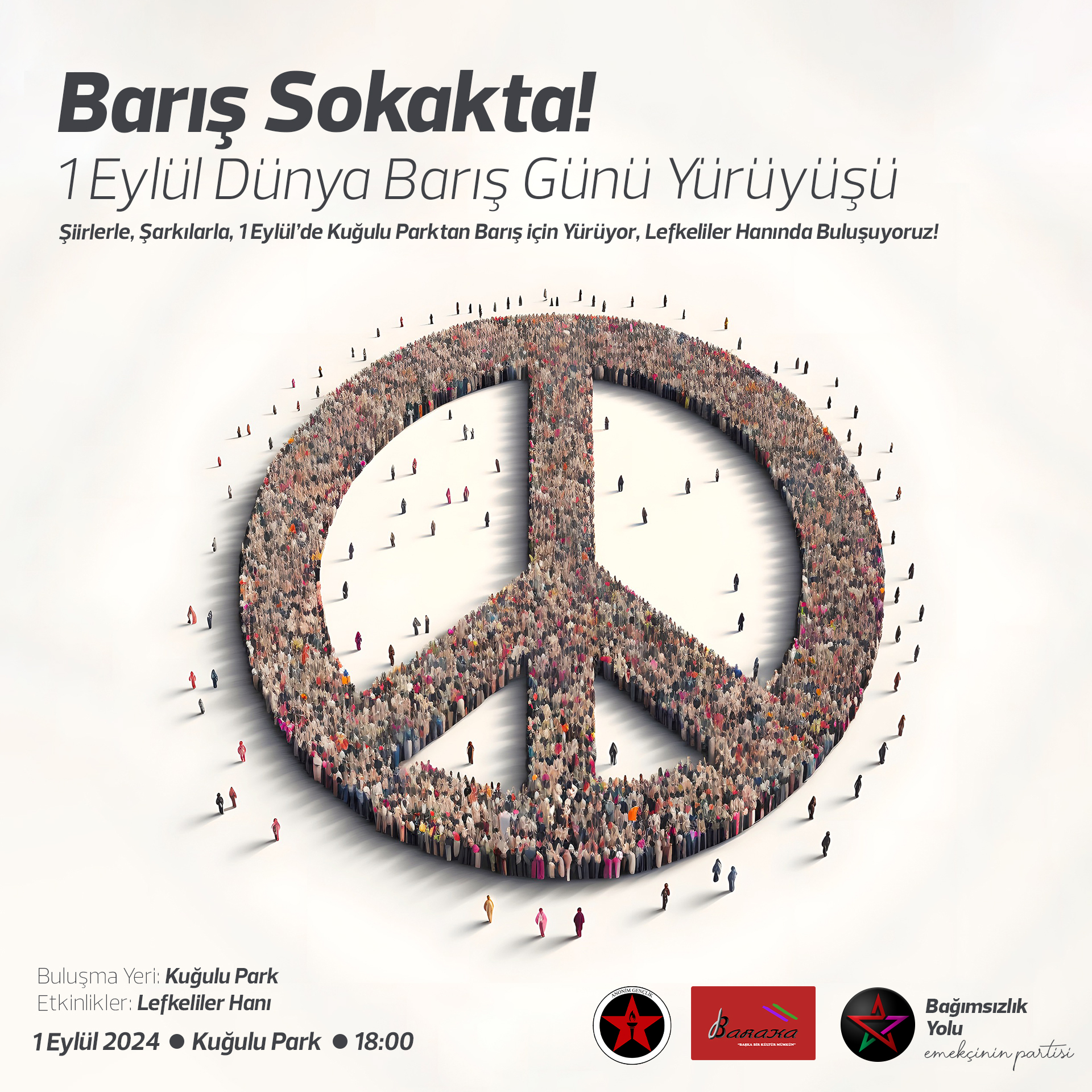 Lefkoşa, 28 Ağustos 24 (TAK): Anonim Gençlik, Bağımsızlık Yolu ve Baraka kültür Merkezi, 1 Eylül Dünya Barış Günü’nde Lefkeliler Hanı’nda ortak eylem düzenleyecek.