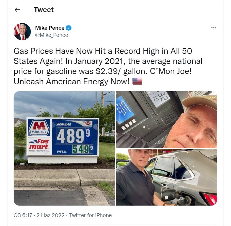 Washington, 6 Haziran 22 (TAK): Eski ABD Başkan Yardımcısı Mike Pence, aracına yakıt alırken yaptığı paylaşımda akaryakıt fiyatlarına sitem etti.