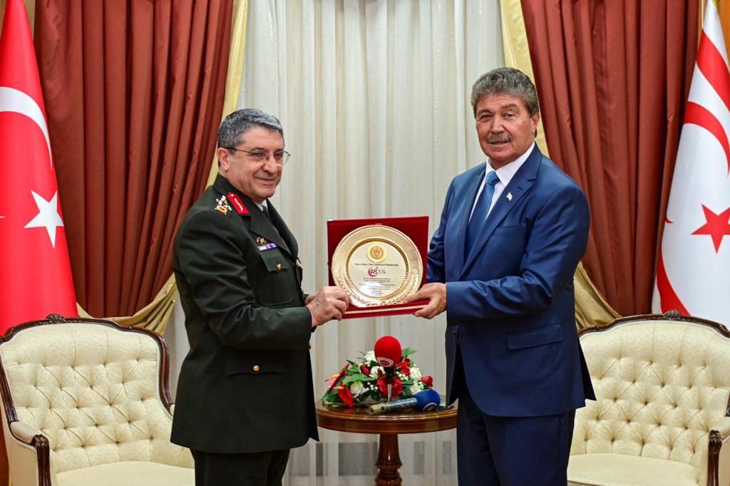 Lefkoşa, 19 Temmuz 22 (TAK): Başbakan Ünal Üstel, 20 Temmuz 1974 Mutlu Barış Harekâtı’nın 48’inci yıldönümü törenlerine katılmak üzere ülkede bulunan Türkiye Cumhuriyeti Milli Savunma Bakanlığı temsilcisi Orgeneral Selçuk Bayraktaroğlu’nu kabul etti.