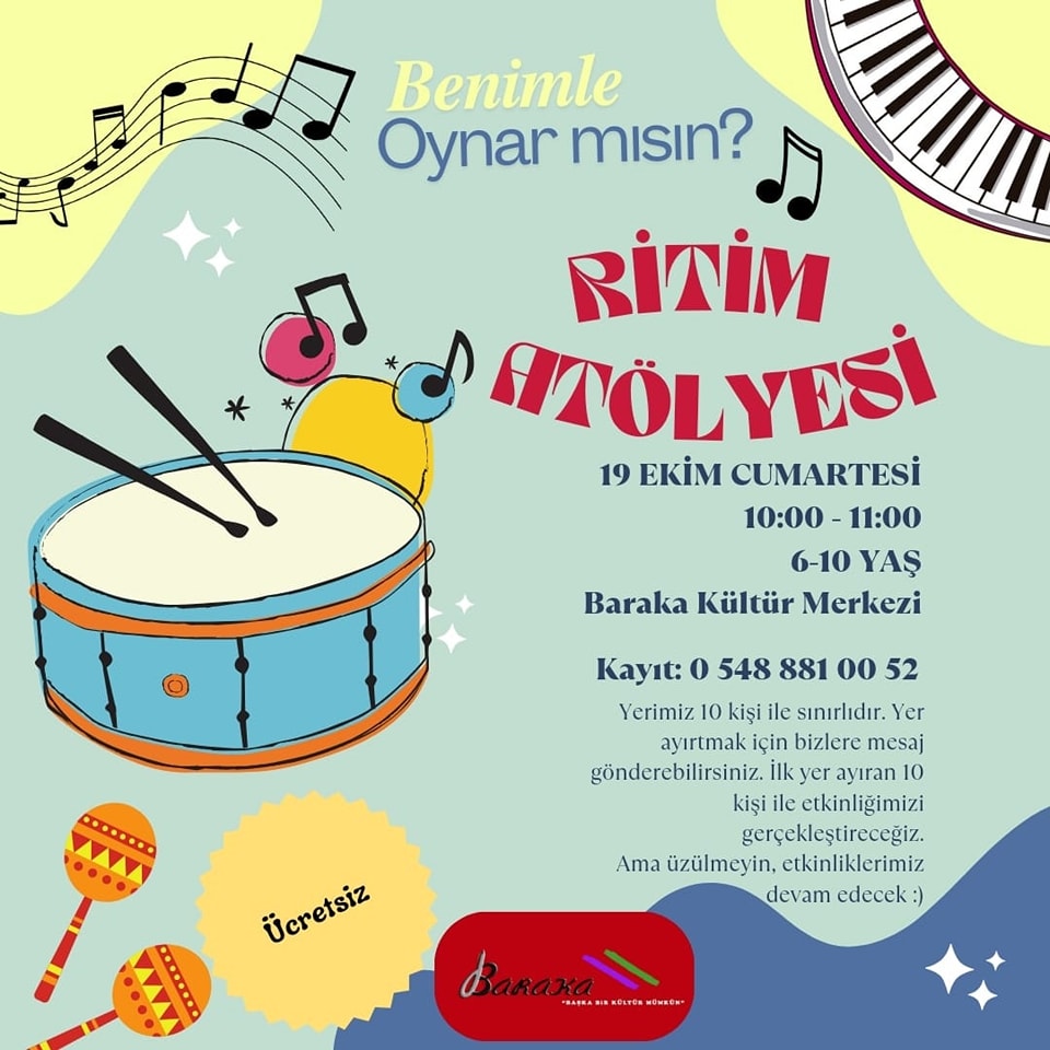 Lefkoşa, 16 Ekim 24 (TAK): Baraka Kültür Merkezi, “Benimle Oynar mısın” etkinlikleri kapsamında Ritim Atölyesi düzenleyecek.