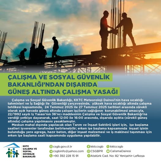 arasında güneşte çalışmak Çalışma Bakanlığı tarafından yasakladı.