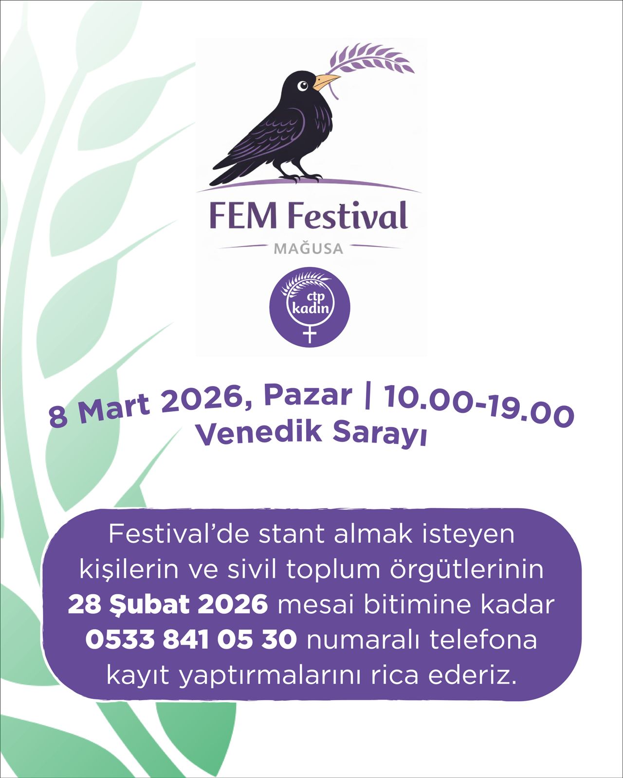 Lefkoşa, 19 Şubat 26 (TAK): Cumhuriyetçi Türk Partisi (CTP) Kadın Örgütü Mağusa İlçesi, 8 Mart Dünya Emekçi Kadınlar Günü dolayısıyla ilk kez “Fem Festival” düzenleyecek.