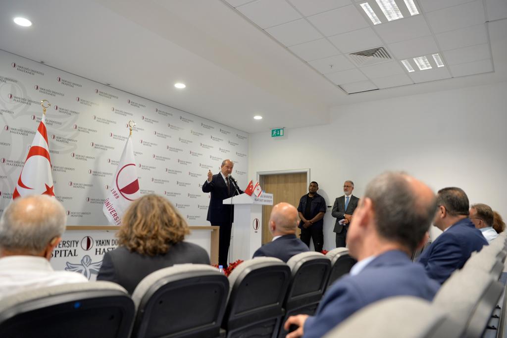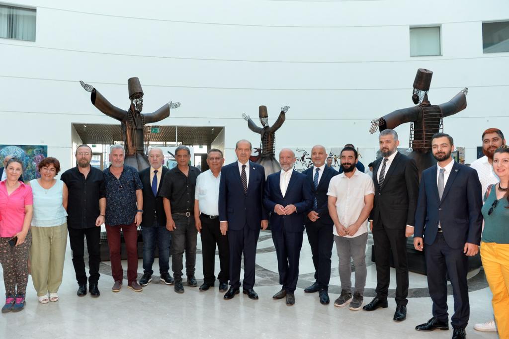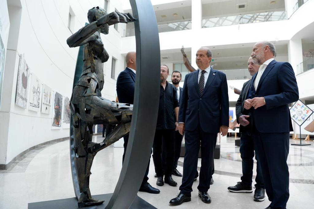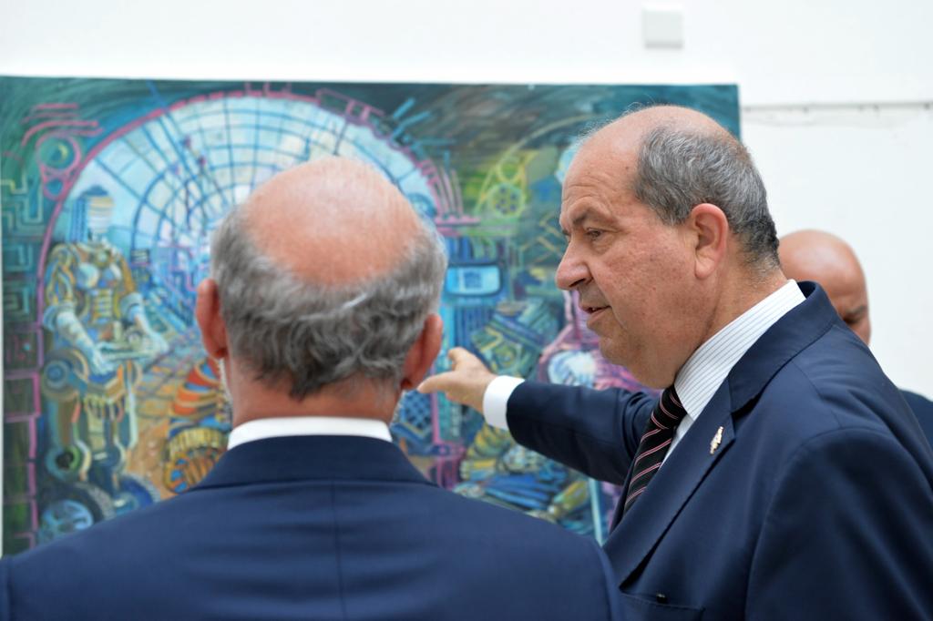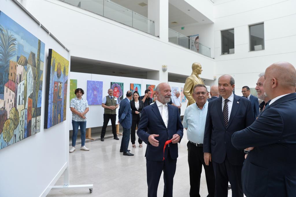 Lefkoşa, 10 Haziran 22 (TAK) Cumhurbaşkanı Ersin Tatar, Yakın Doğu Üniversitesi Güzel Sanatlar ve Tasarım Fakültesi sanatçılarının hazırladığı 412. serginin açılışına katıldı.