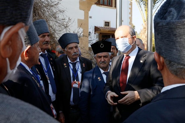 Lefkoşa, 25 Mart 22 (TAK): Cumhurbaşkanı Ersin Tatar, Türkiye Cumhuriyeti Mersin Valiliği öncülüğünde ve Mersin Üniversitesi ile Doğu Akdeniz Üniversitesi rektörlükleri iş birliğinde KKTC’nin kuruluşunun 38. yıl dönümünde Kıbrıs’ta şehit silah arkadaşlarının kabirlerini ziyaret etmek amacıyla KKTC’ye gelen 38 Mersinli Kıbrıs gazisinden oluşan heyeti kabul etti.