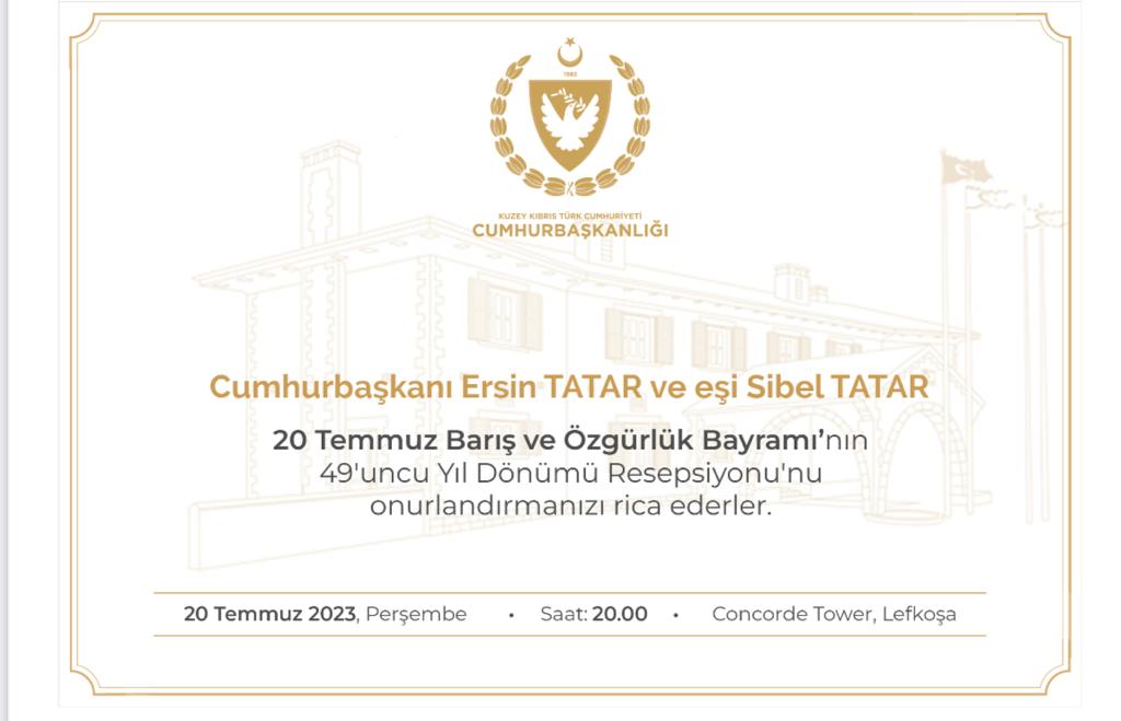 Lefkoşa, 19 Temmuz 23(TAK): Cumhurbaşkanı Ersin Tatar ve Eşi Sibel Tatar, yarın 20 Temmuz Barış ve Özgürlük Bayramı Resepsiyonu düzenleyecek.