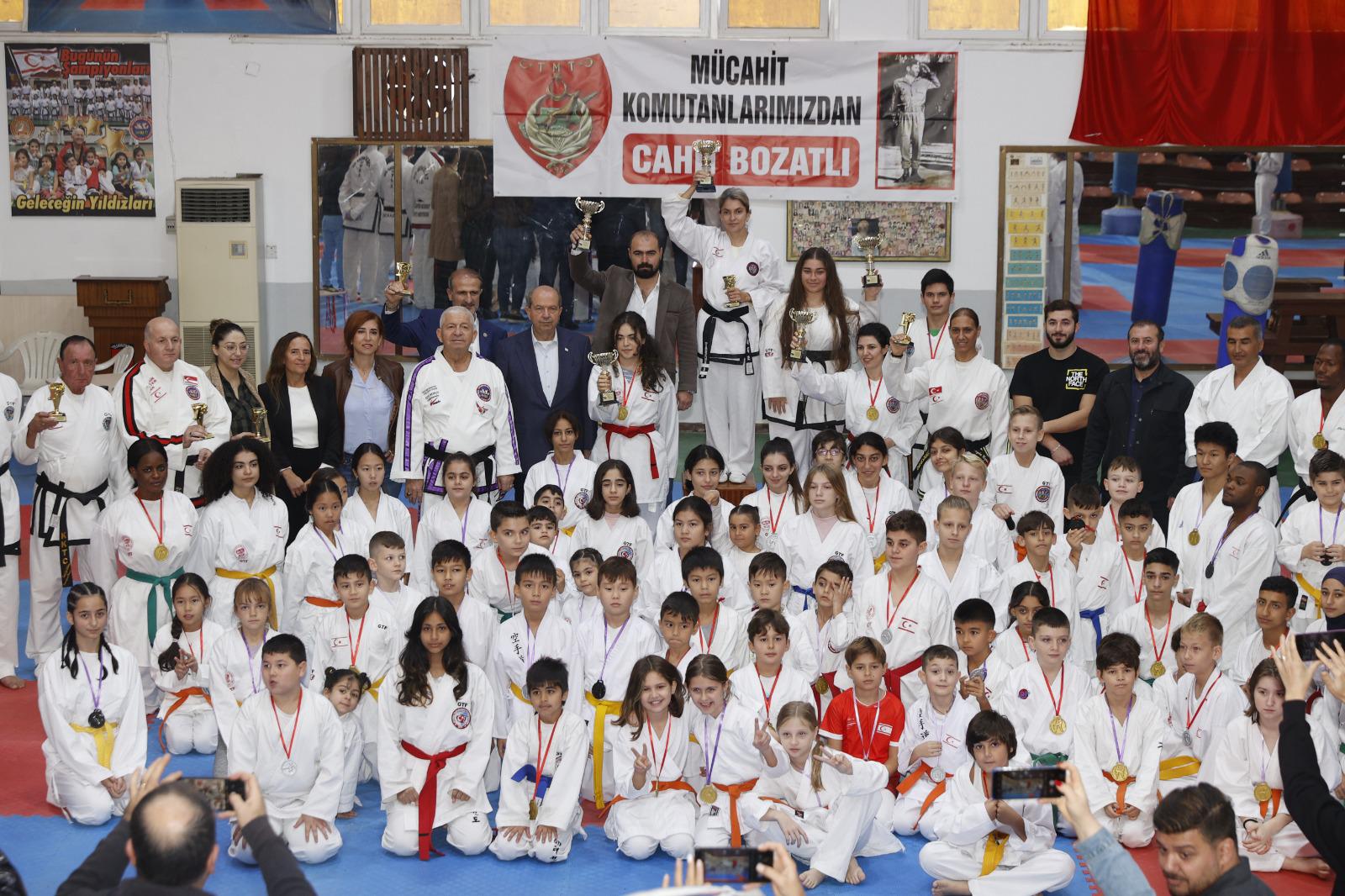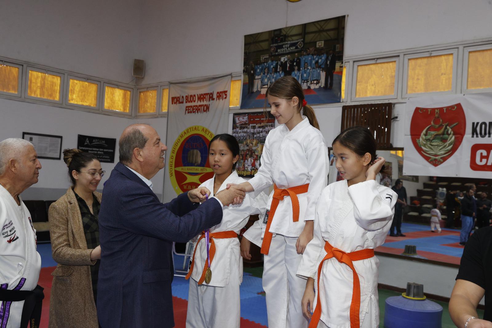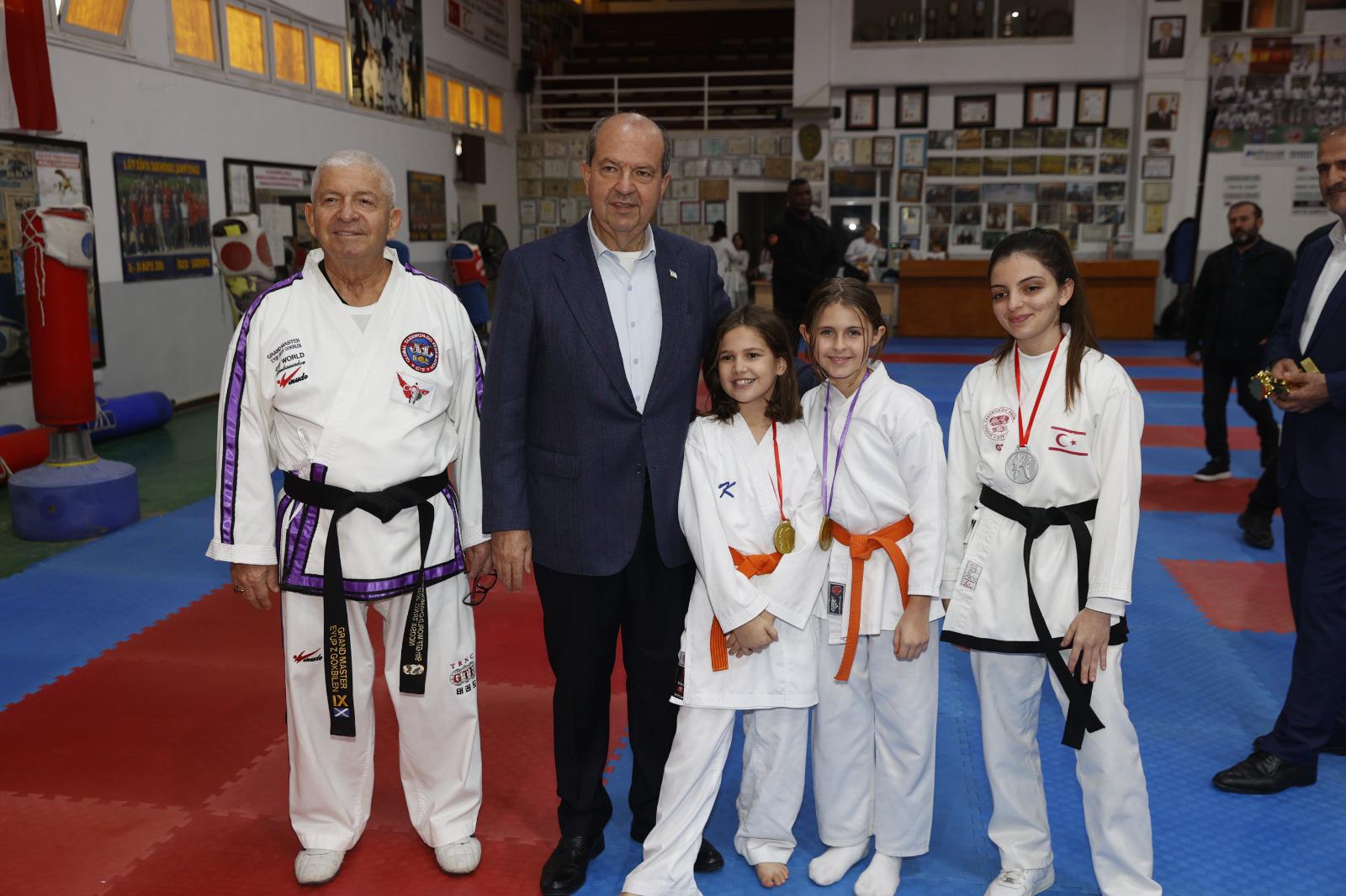 Lefkoşa, 19 Aralık 22 (TAK): Cumhurbaşkanı Ersin Tatar, mücahit komutanlardan merhum Cahit Bozatlı anısına düzenlenen Taekwondo, Karate, Budo, Kırış müsabakalarını izledi