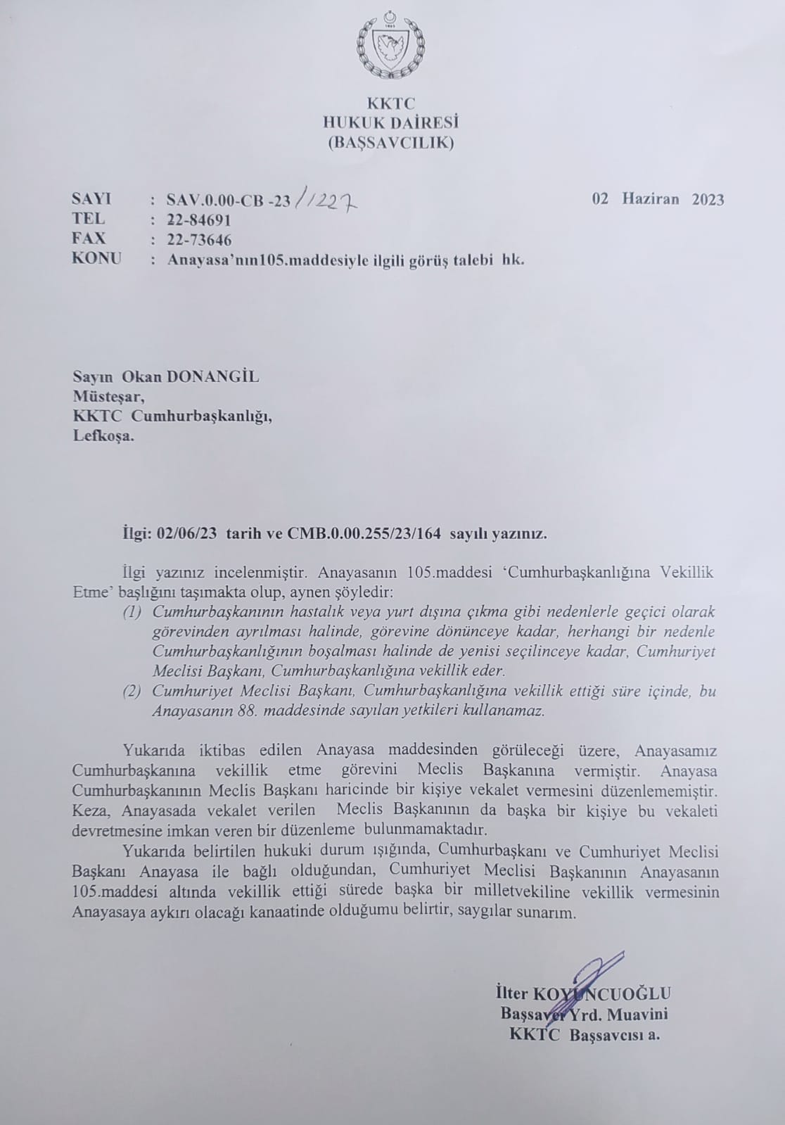 Lefkoşa, 8 Haziran 23 (TAK): Cumhurbaşkanlığı, “Cumhurbaşkanlığı vekâleti” konusunda Başsavcılık tarafından verilen hukuki görüşü paylaştı. Başsavcılık görüşünde, “Anayasa’mız Cumhurbaşkanı’nın Meclis Başkanı haricinde bir kişiye vekâlet vermesini düzenlememiştir. Keza, Anayasa’da vekâlet verilen Meclis Başkanı’nın da başka bir kişiye bu vekâleti devretmesine imkân veren bir düzenleme bulunmamaktadır” ifadelerine yer verildiği bildirildi.