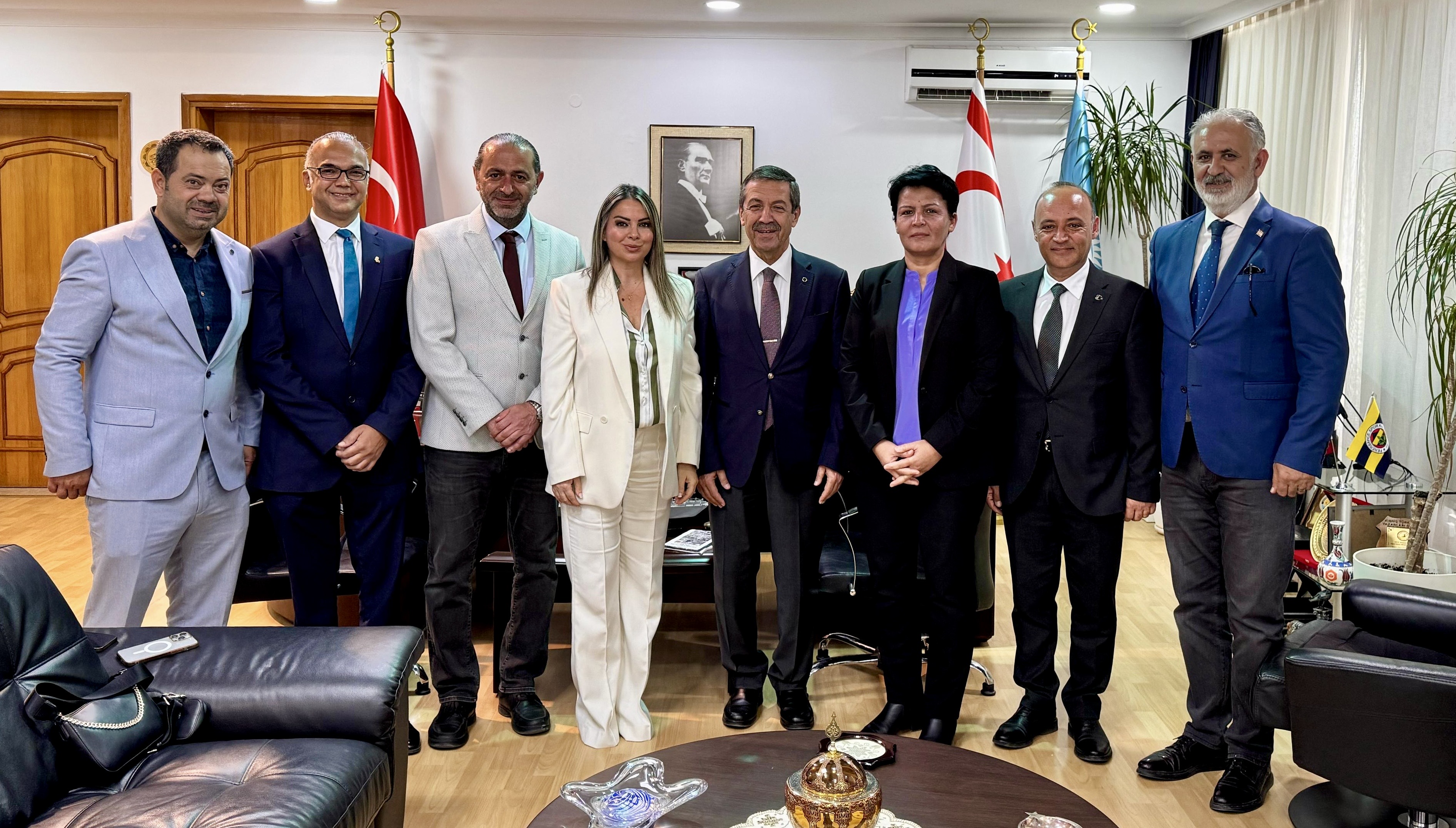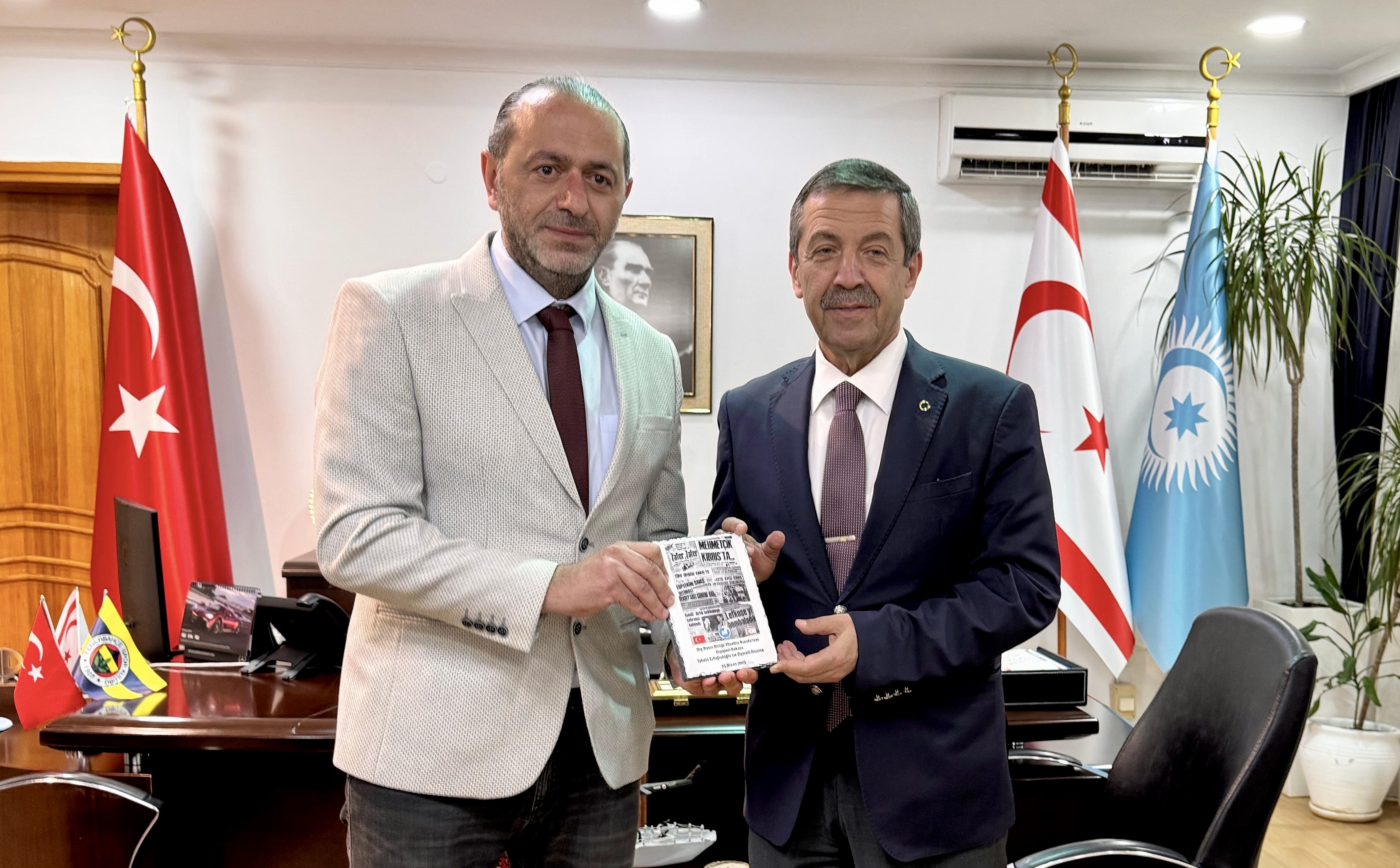 Lefkoşa, 25 Nisan 25 (TAK): Dışişleri Bakanı Tahsin Ertuğruloğlu, Burhan Canbaz başkanlığındaki Dış Basın Birliği (DBB) Yönetim Kurulu üyelerini kabul ederek, görüştü.