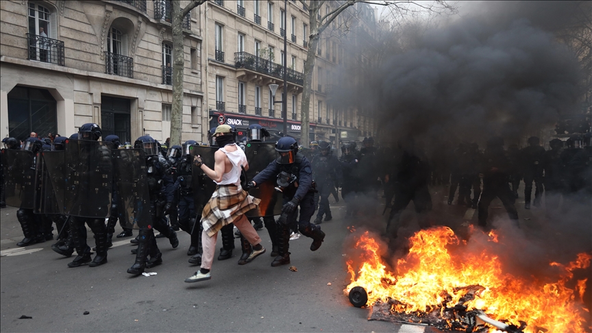 Paris, 29 Mart 23 (TAK): Fransa'da, emeklilik reformu karşıtı gösterilerde polis ile protestocular arasında arbede çıktı.