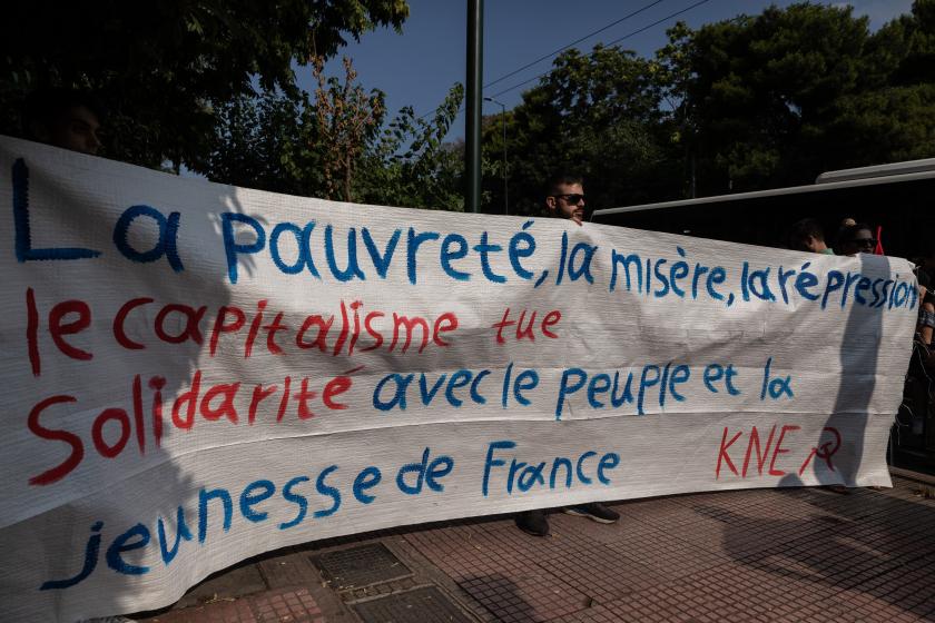 Atina, 4 Temmuz 23 (TAK): Fransa'da 27 Haziran'da 17 yaşındaki Nael M. isimli gencin polis kurşunuyla öldürülmesi, Yunanistan'ın başkenti Atina'daki Fransız Büyükelçiliğinin önünde protesto edildi.