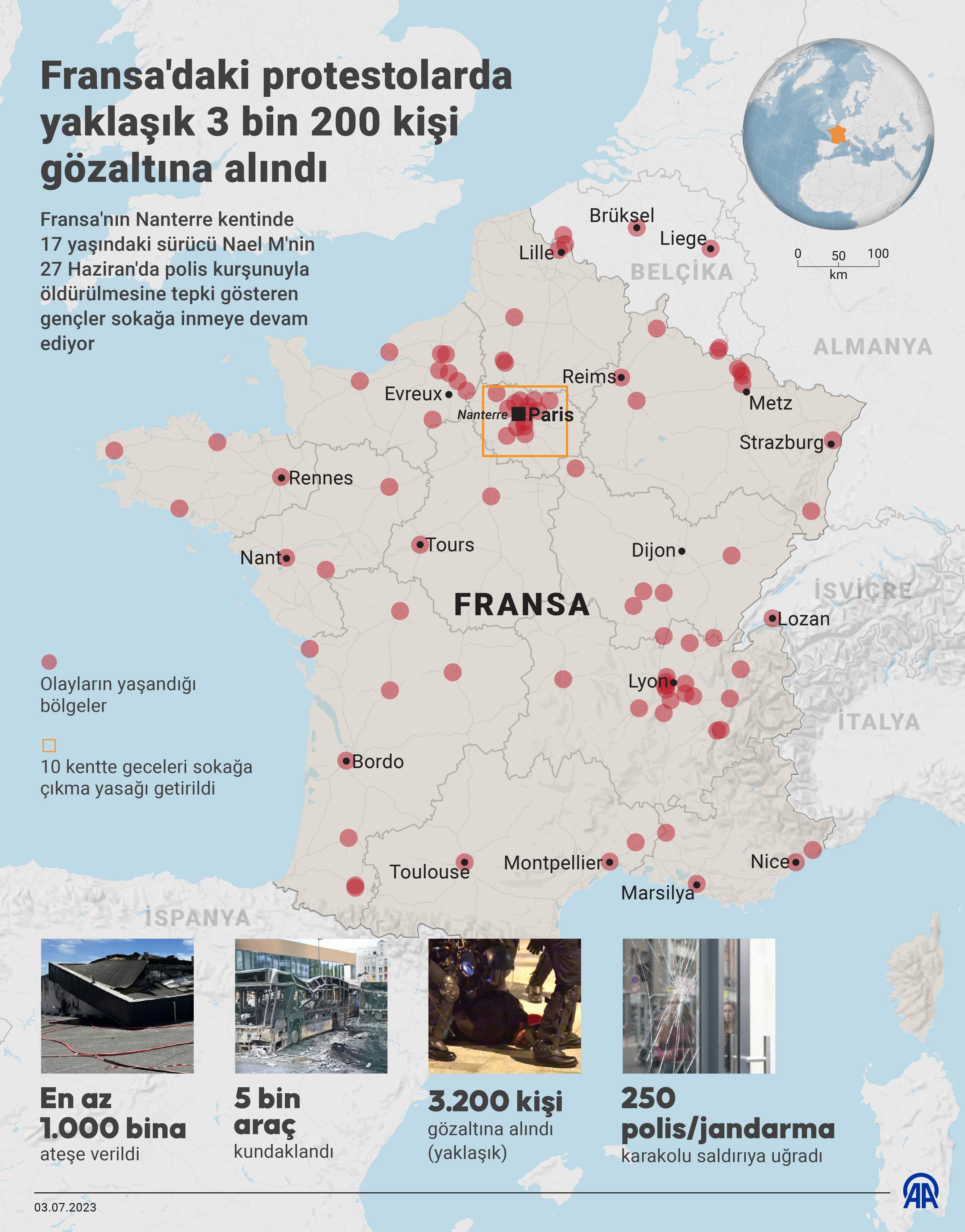 Fransa, 3 Temmuz 23 (TAK):Fransa'nın Nanterre kentinde 17 yaşındaki sürücü Nael M'nin 27 Haziran'da polis kurşunuyla öldürülmesine tepki gösteren gençler sokağa inmeye devam ediyor, ülke genelinde şimdiye kadar en az 1000 binayla 5 bin araç ateşe verildi ve yaklaşık 3 bin 200 kişi gözaltına alındı.