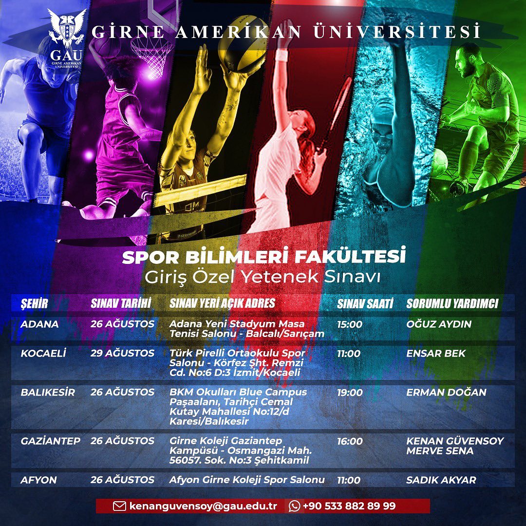 Lefkoşa, 22 Ağustos 22 (TAK): Girne Amerikan Üniversitesi (GAÜ), Spor Bilimleri Fakültesi için Türkiye’nin bazı illerinde “Giriş Özel Yetenek Sınavı” düzenleyecek.
