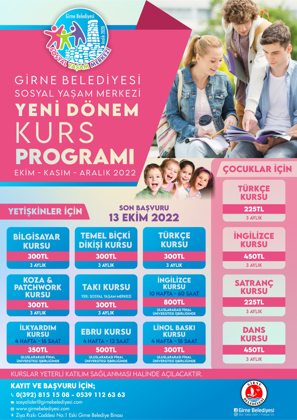 Lefkoşa, 3 Ekim 22 (TAK): Girne Belediyesi Sosyal Yaşam Merkezi’nde (Eski Girne Belediye Hizmet Binası); yeni dönem kurs kayıtlarına başlandı.