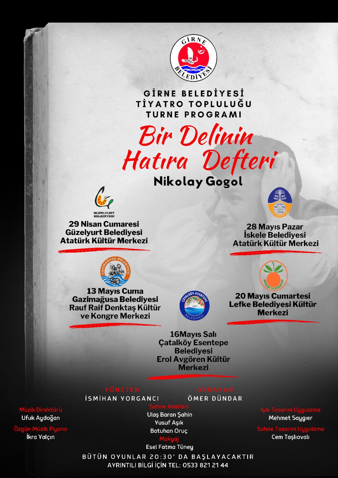 Lefkoşa, 24 Nisan 23 (TAK): Girne Belediyesi Tiyatro Topluluğu, Nikolay Gogol’un yazdığı “Bir Delinin Hatıra Defteri” adlı oyun ile turneye çıkıyor.