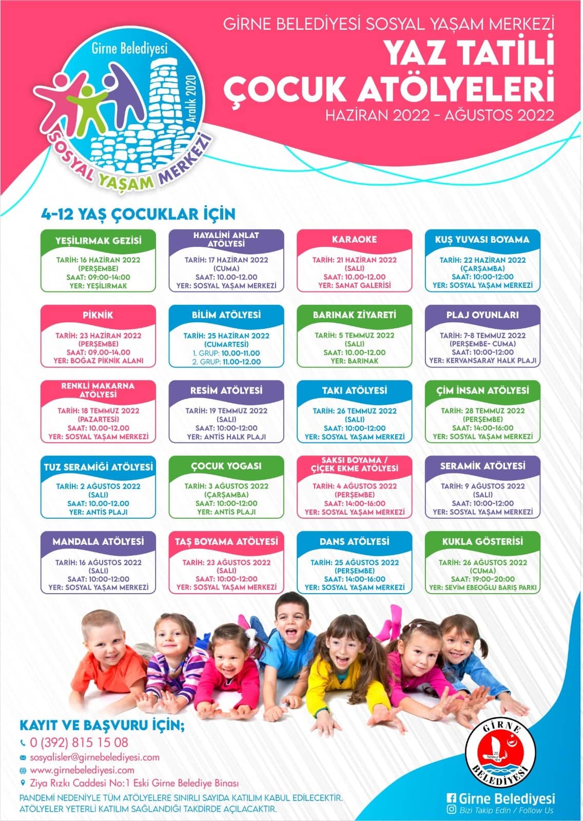 Lefkoşa, 31 Mayıs 22 (TAK): Girne Belediyesi’nin her yıl yaz tatillerinde 4-12 yaş arası çocuklar için düzenlediği ücretsiz yaz atölyeleri bu yıl da 16 Haziran-26 Ağustos tarihleri arasında yapılacak.