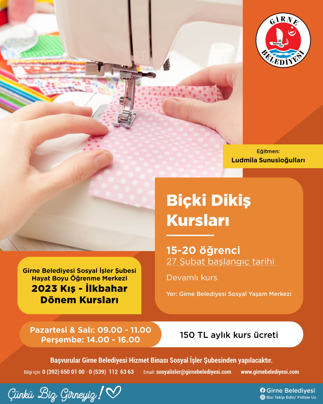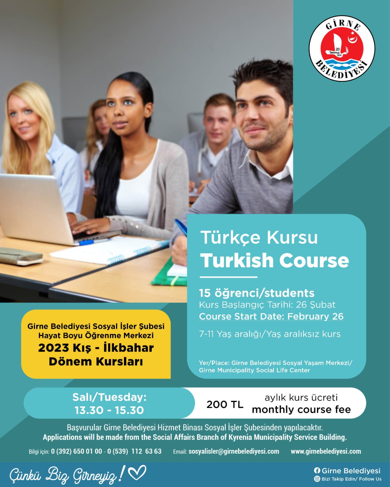 Lefkoşa, 3 Şubat 23 (TAK): Girne Belediyesi Sosyal İşler Şubesi Hayat Boyu Öğrenme Merkezi, 2023 Kış-İlkbahar Dönemi Kursları çerçevesinde 7 farklı kurs başlatıyor.