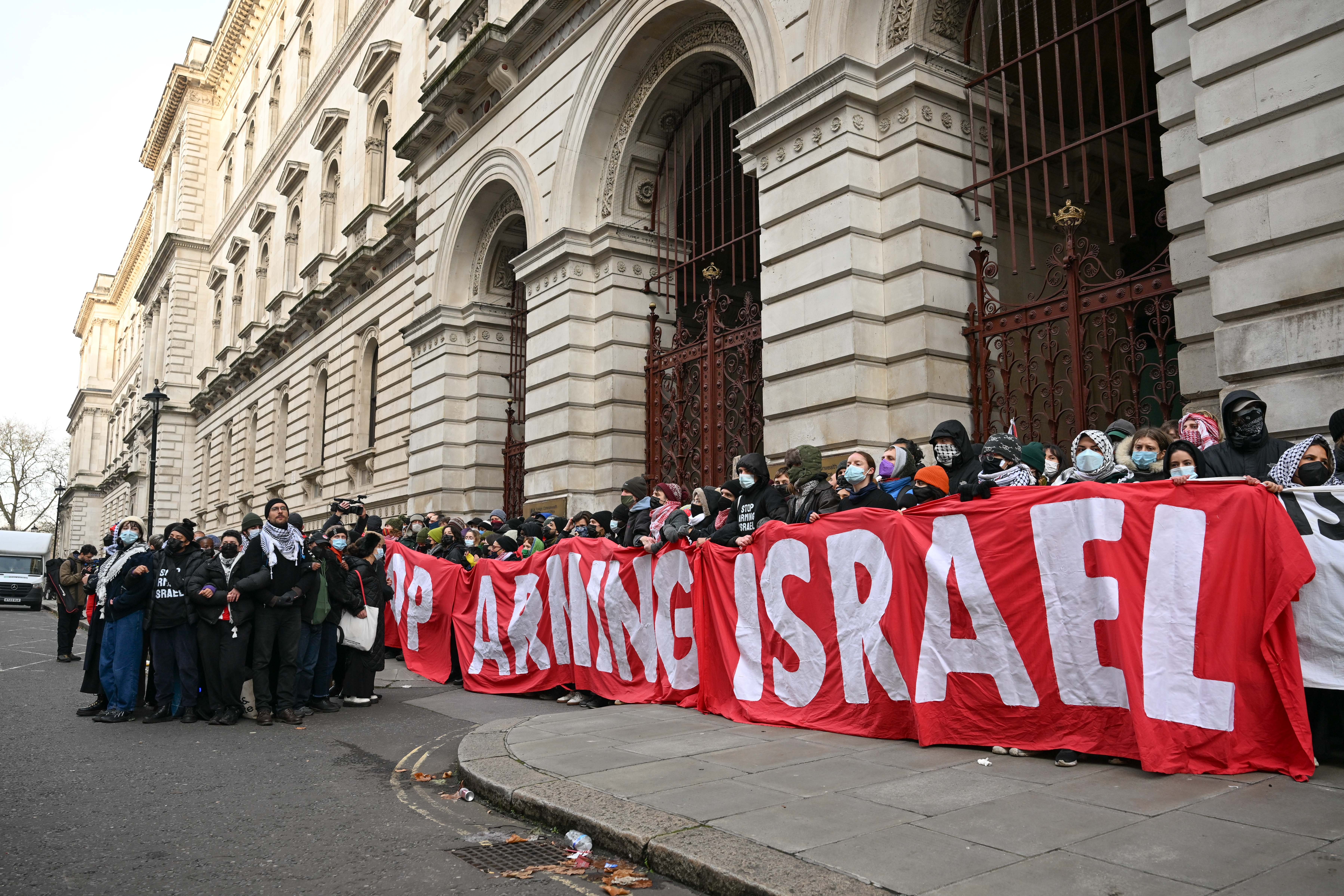 Londra, 28 Kasım 24 (TAK): İngiltere'de Filistin destekçisi gruplar, Dışişleri Bakanlığının girişini kapatarak İngiltere'nin İsrail'e tüm silah satışını sonlandırması çağrısında bulundu.