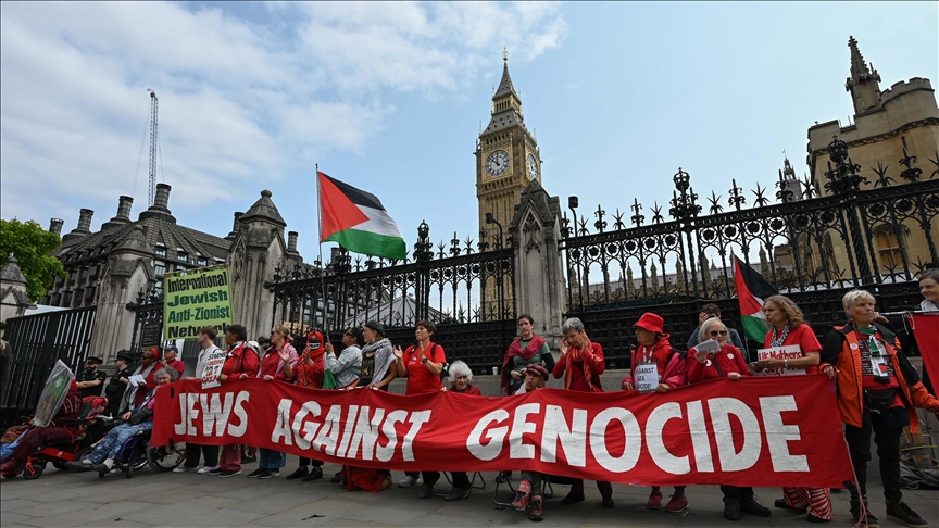 Londra, 4 Haziran 25 (TAK): İngiltere'nin İsrail'e silah satışını protesto eden binlerce gösterici, başkent Londra'daki parlamento binası önünde kırmızı renkte giysiler ve ellerinde tuttukları metrelerce uzunluktaki örtüyle insan zinciri oluşturarak sembolik "kırmızı duvar" ördü.