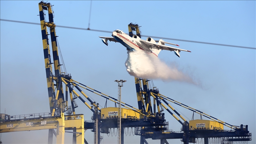 Hatay, 9 Şubat 23 (TAK): Kahramanmaraş merkezli 10 ili etkileyen depremler sırasında Hatay'ın İskenderun ilçesindeki liman sahasında bulunan konteynerlerde çıkan yangının kontrol altına alınmasının ardından soğutma çalışması yürütülüyor.