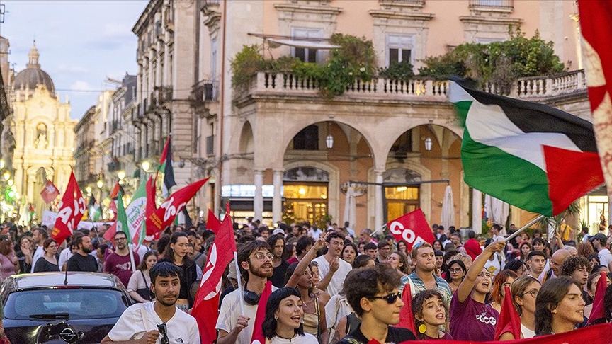 Roma, 4 Eylül 25 (TAK): İtalya'nın güneyindeki Katanya kentinde binlerce kişi, İsrail'in ablukasını kırmak için İspanya'dan Gazze'ye doğru yola çıkan Küresel Sumud Filosu'na ve Filistinlilere destek için yürüdü.