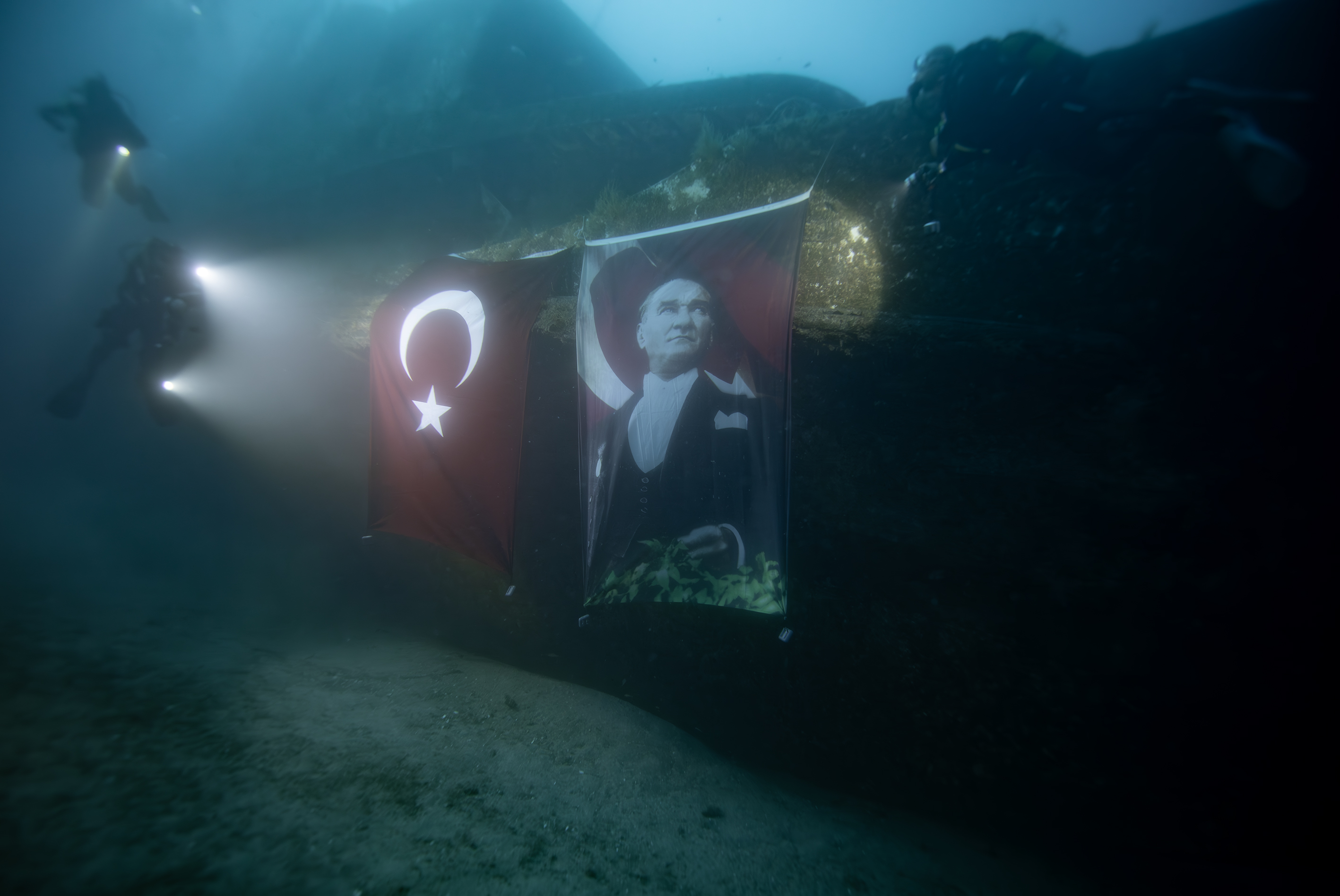 İzmir, 29 Ekim 23 (TAK): İzmir'in Karaburun ilçesinde bir grup dalgıç, Cumhuriyet'in 100. yıl dönümü etkinlikleri kapsamında su altında Türk bayrağı ve Atatürk posteri açtı.