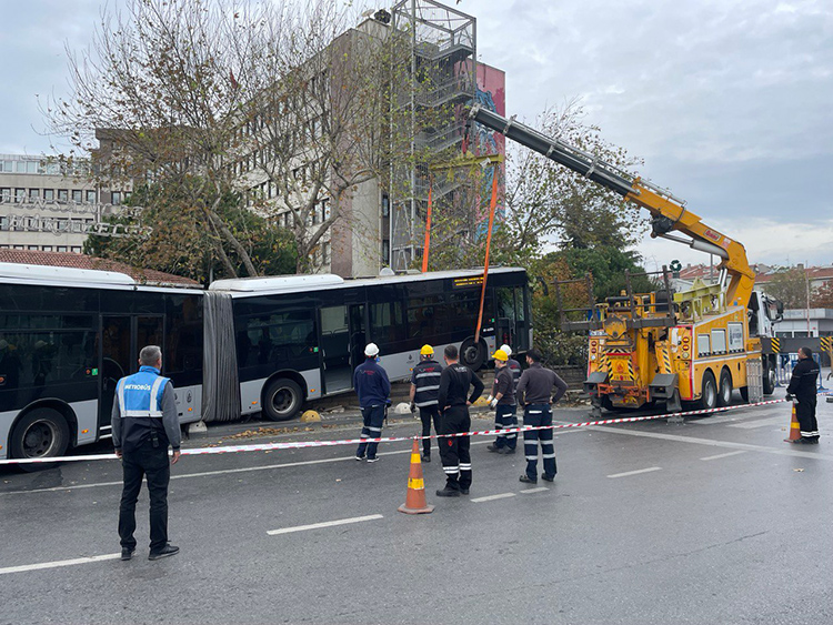 İstanbul, 17 Kasım 22 (TAK): Kadıköy'de, çarptığı belediyenin bahçe duvarında asılı kalan metrobüsün sürücüsü ile bir yaya yaralandı.