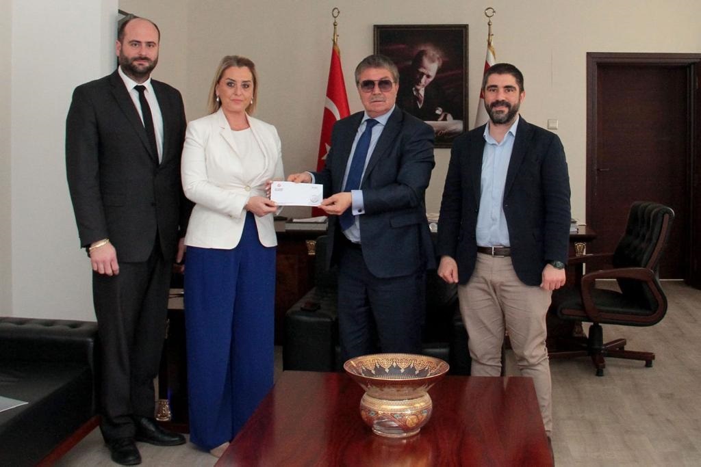 yardım makbuzunu Başbakan Ünal Üstel’e takdim etti.